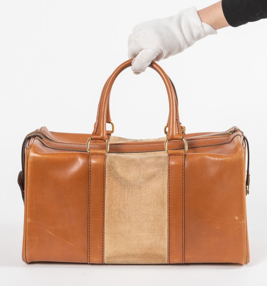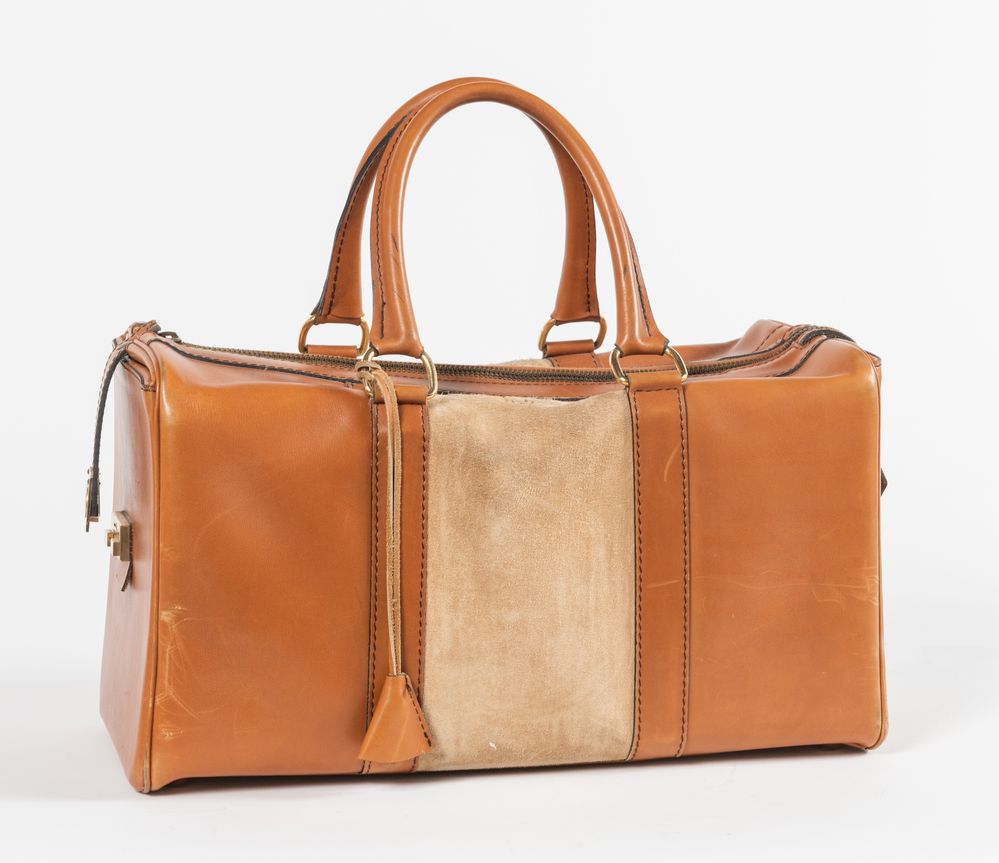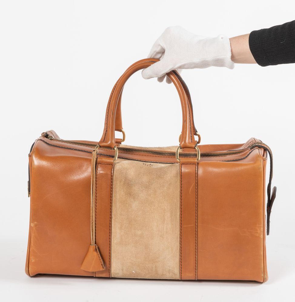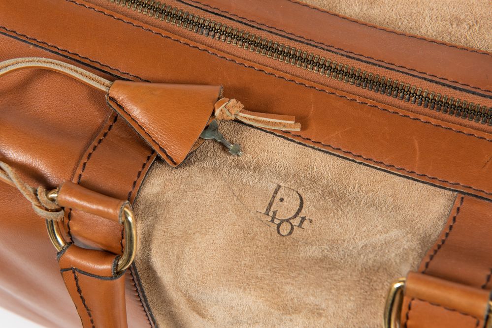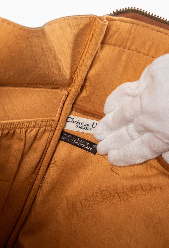 CHRISTIAN DIOR Borsa da viaggio in pelle liscia e scamosciata sui toni beige e cuoio. Chiusura e dettagli in metallo dorato. Interno rifinito in tela logata con cinque vani portaoggetti. Cm 24x40x20. Altezza con manici: cm 40. Reca marchi Dior, CD ed etichette Christian Dior bagages Paris Made in France e Made in France garanti Scotchgard. Corredato di chiavi originali. (Difetti)