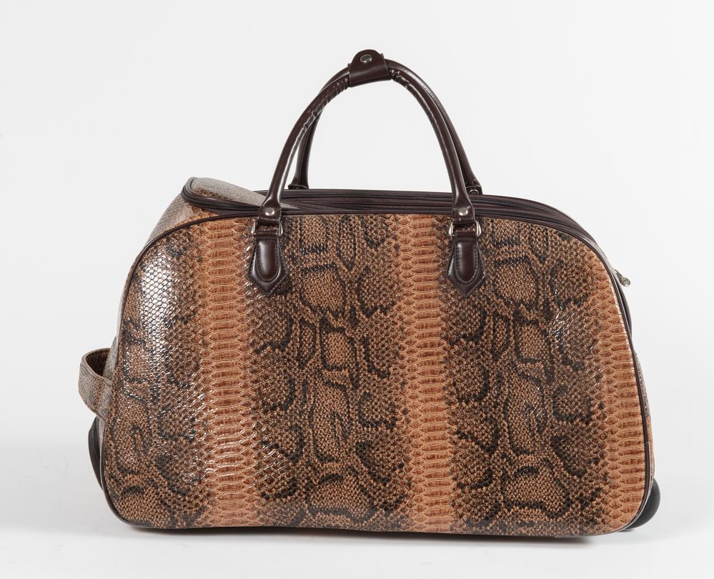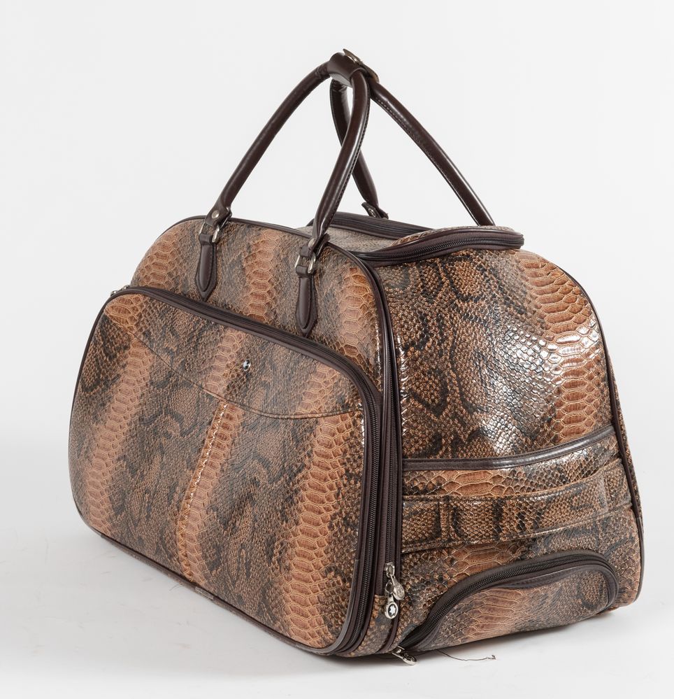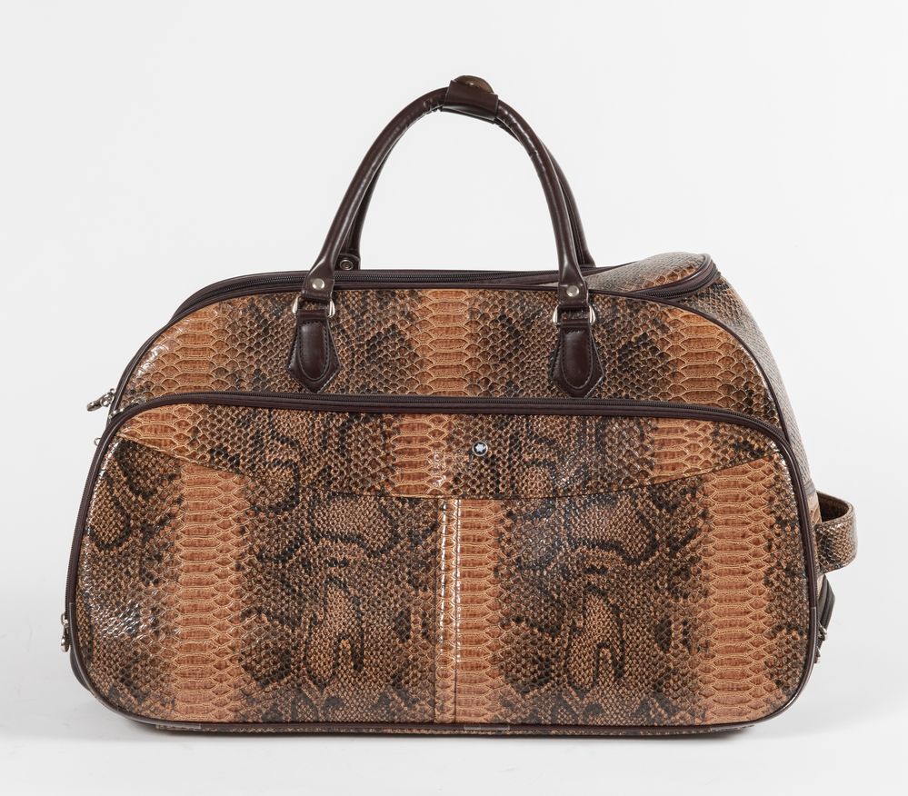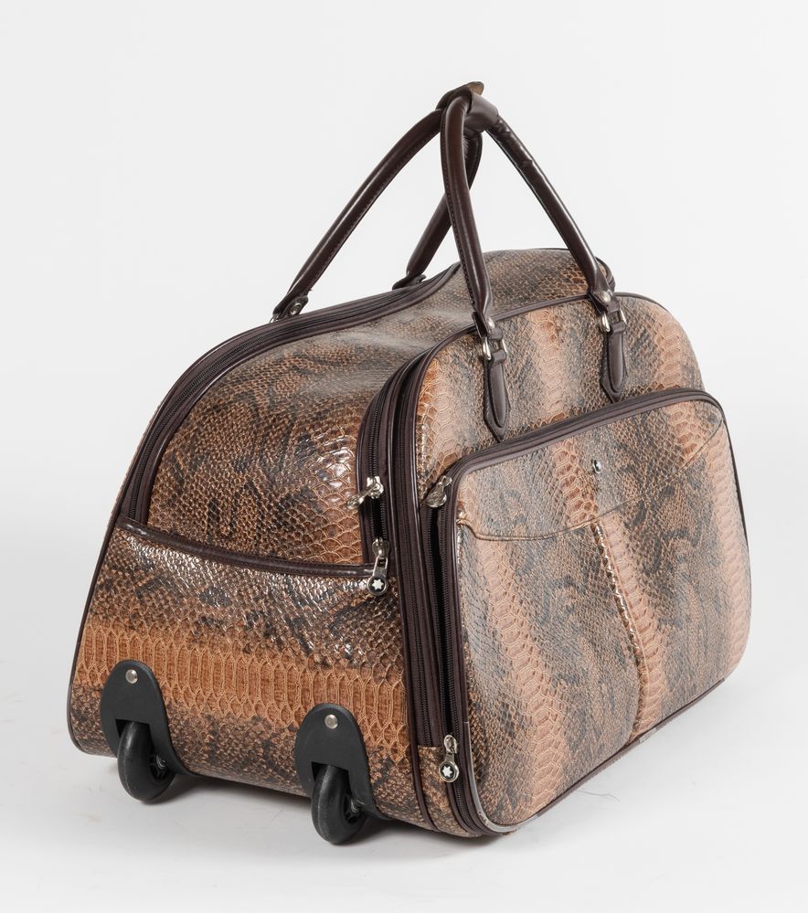 MONT BLANC Borsa da viaggio da utilizzare a mano o a trolley in pelle stampata a pitone sui toni del marrone. Cm 35x56x34. Altezza con manico: cm 50. Reca marchi Mont Blanc.