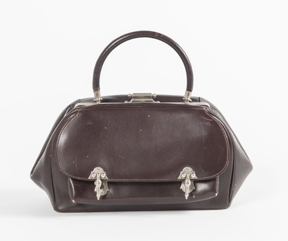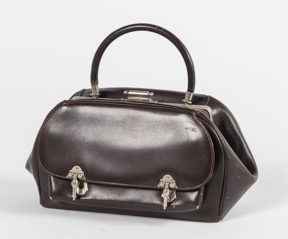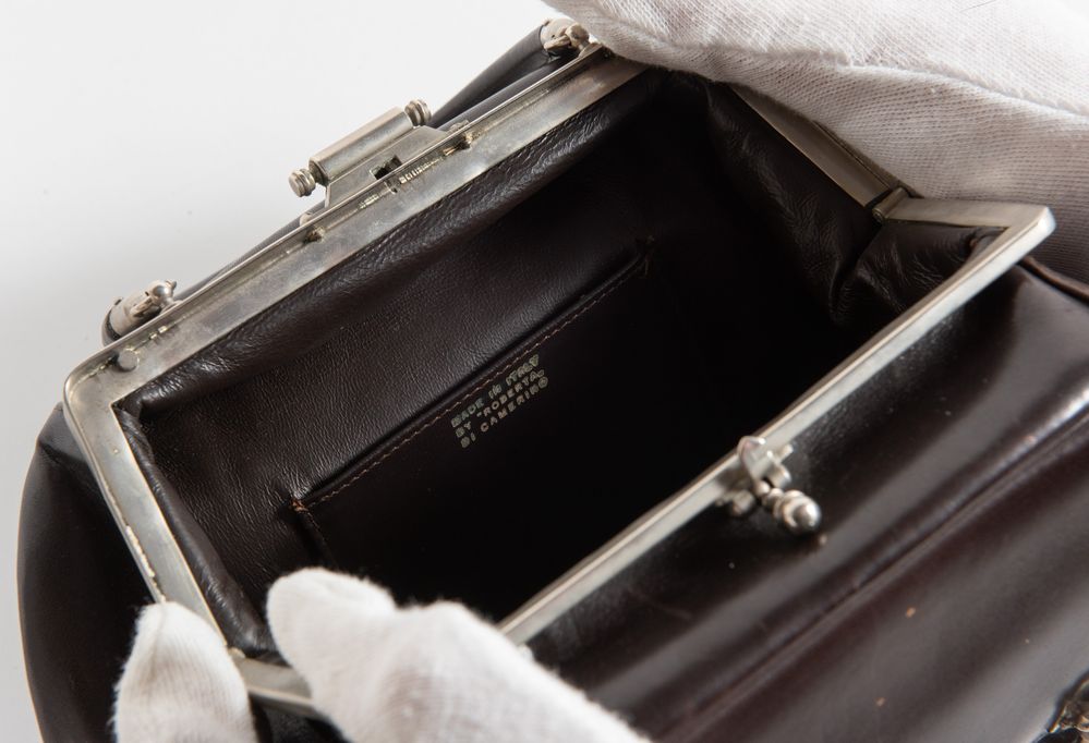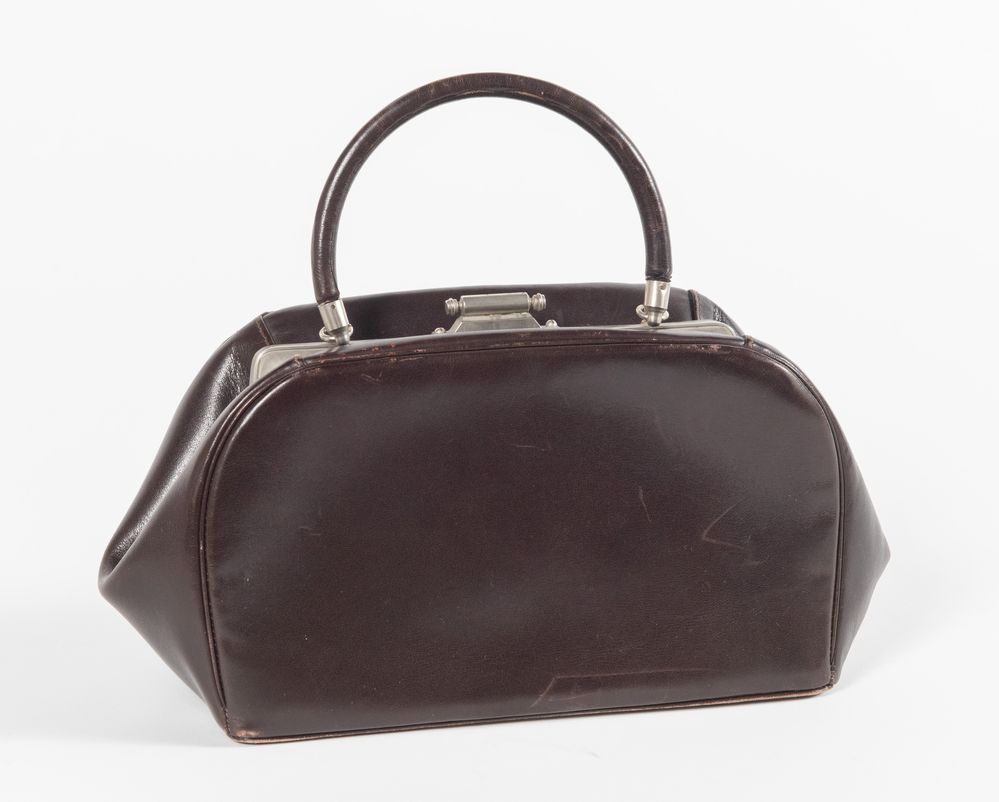 ROBERTA DI CAMERINO Borsa a mano in pelle marrone con dettagli e rifiniture in metallo argentato. Anni '60. Cm 13x21x11. Altezza con manico: cm 22. Interno in pelle con piccola taschina. Reca marchio Made in Italy by Roberta di Camerino. (Lievi difetti)