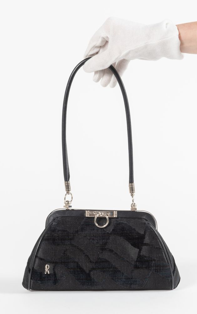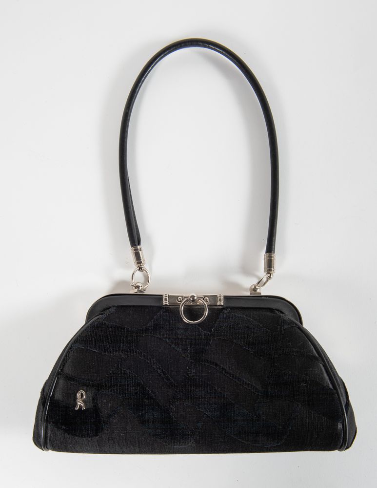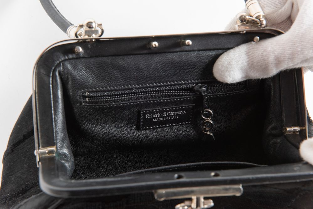 ROBERTA DI CAMERINO Borsa da spalla nera in velluto con rifiniture in pelle e in metallo argentato. Cm 14x25,5x6. Altezza con manico: cm 37,5. Interno in pelle nera con due taschine di cui una chiusa da cerniera. Reca marchi R e Roberta di Camerino Made in Italy.