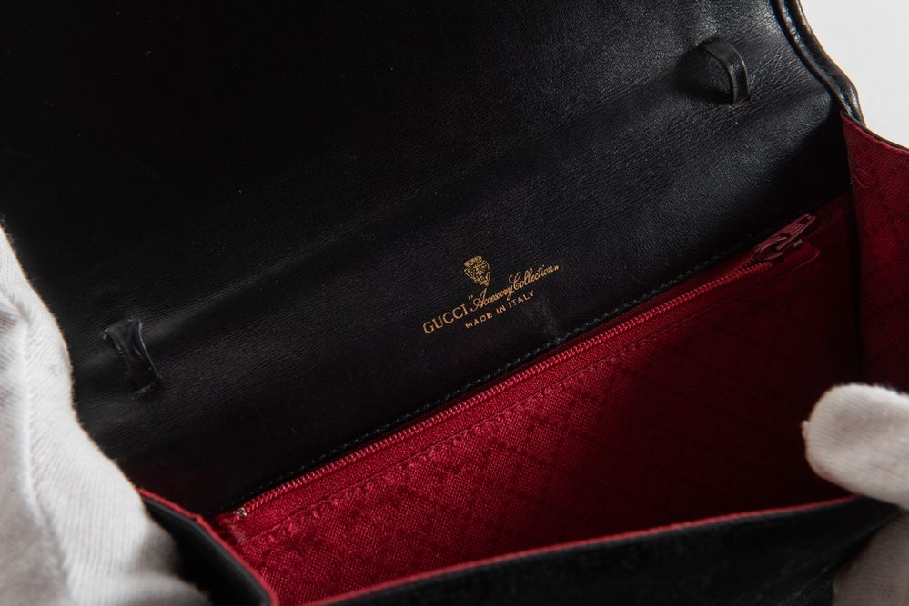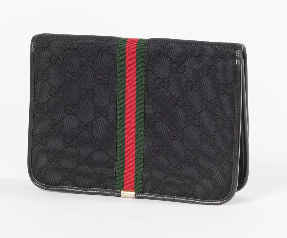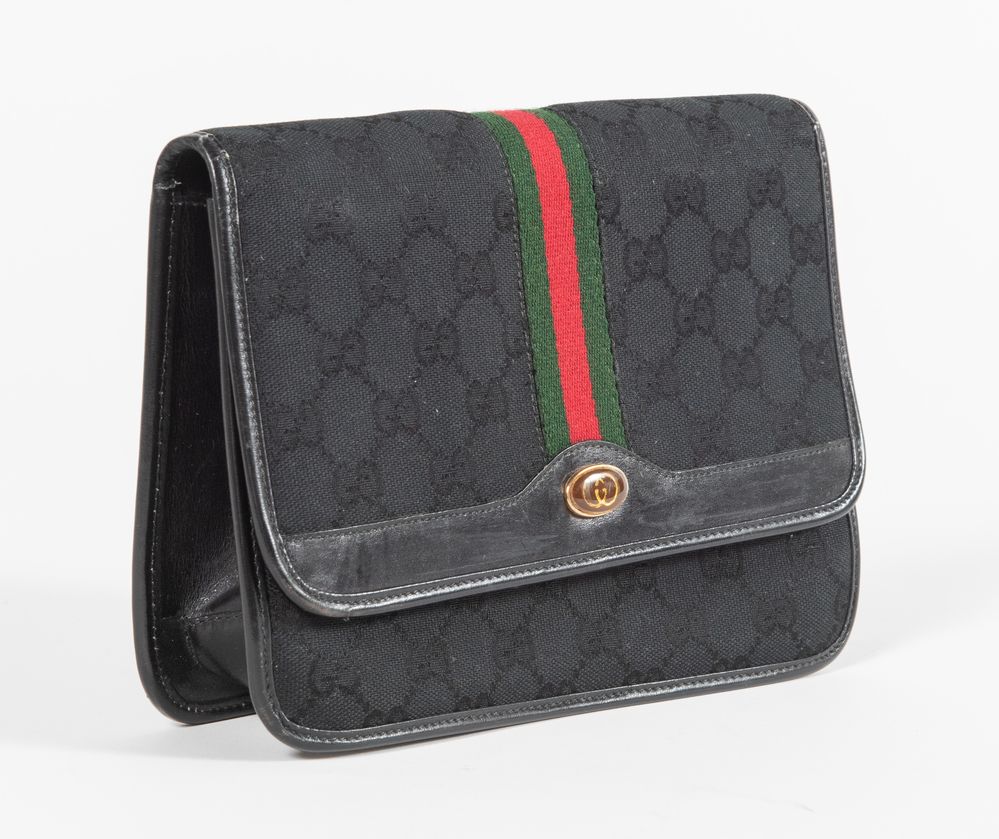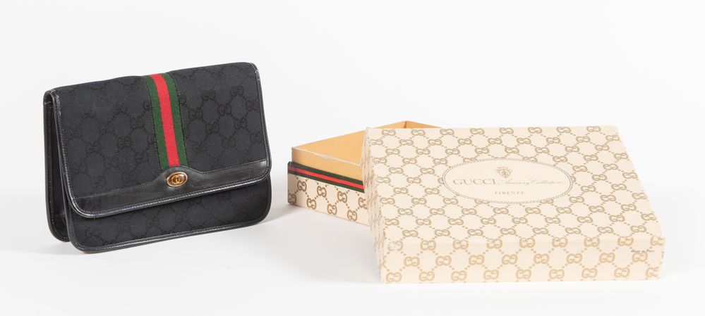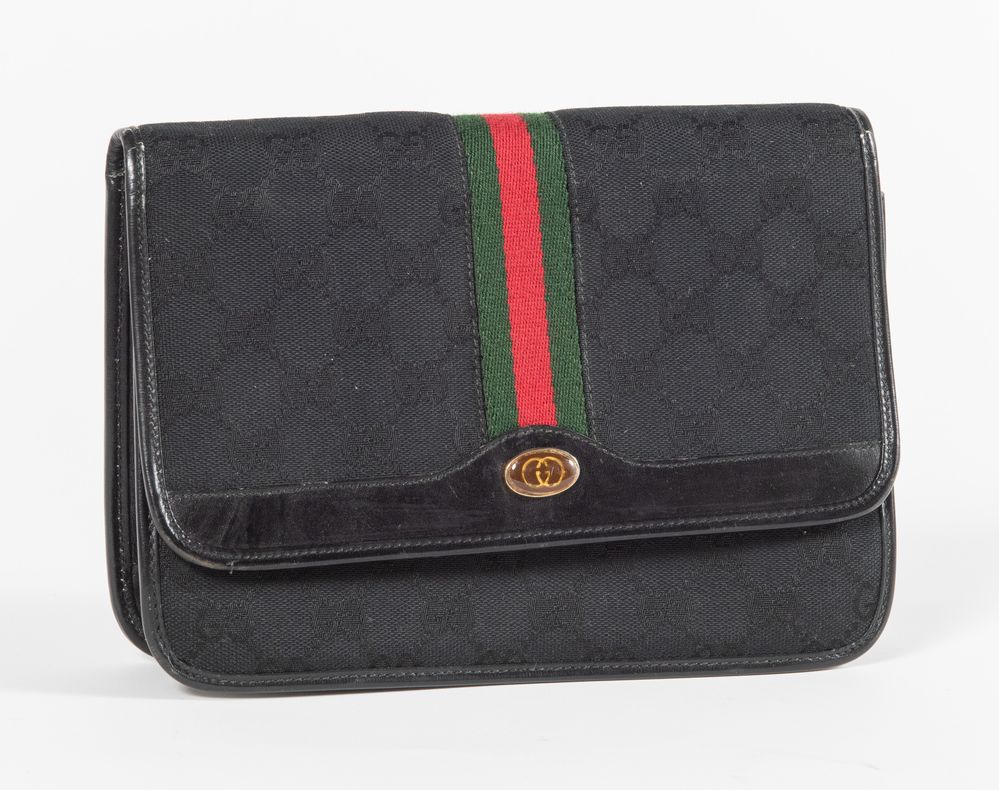 GUCCI Piccola borsa in tela monogram nera e rifiniture in pelle. Dettaglio Gucci web centrale. Cm 17x22,5x6. Interno in tela e pelle con tasca chiusa da cerniera. Reca marchi GG e Gucci "Accessory Collection" Made in Italy. Corredata da scatola originale. (Difetti)