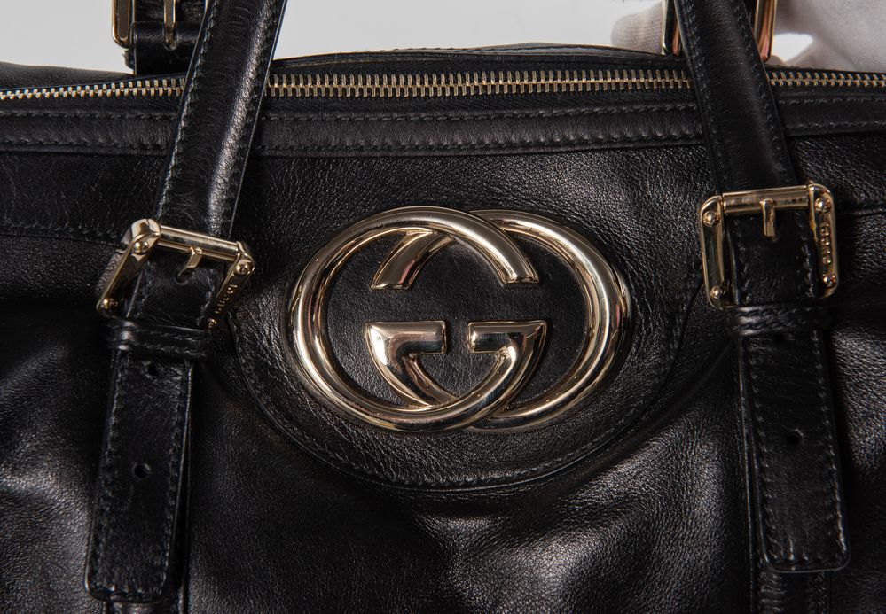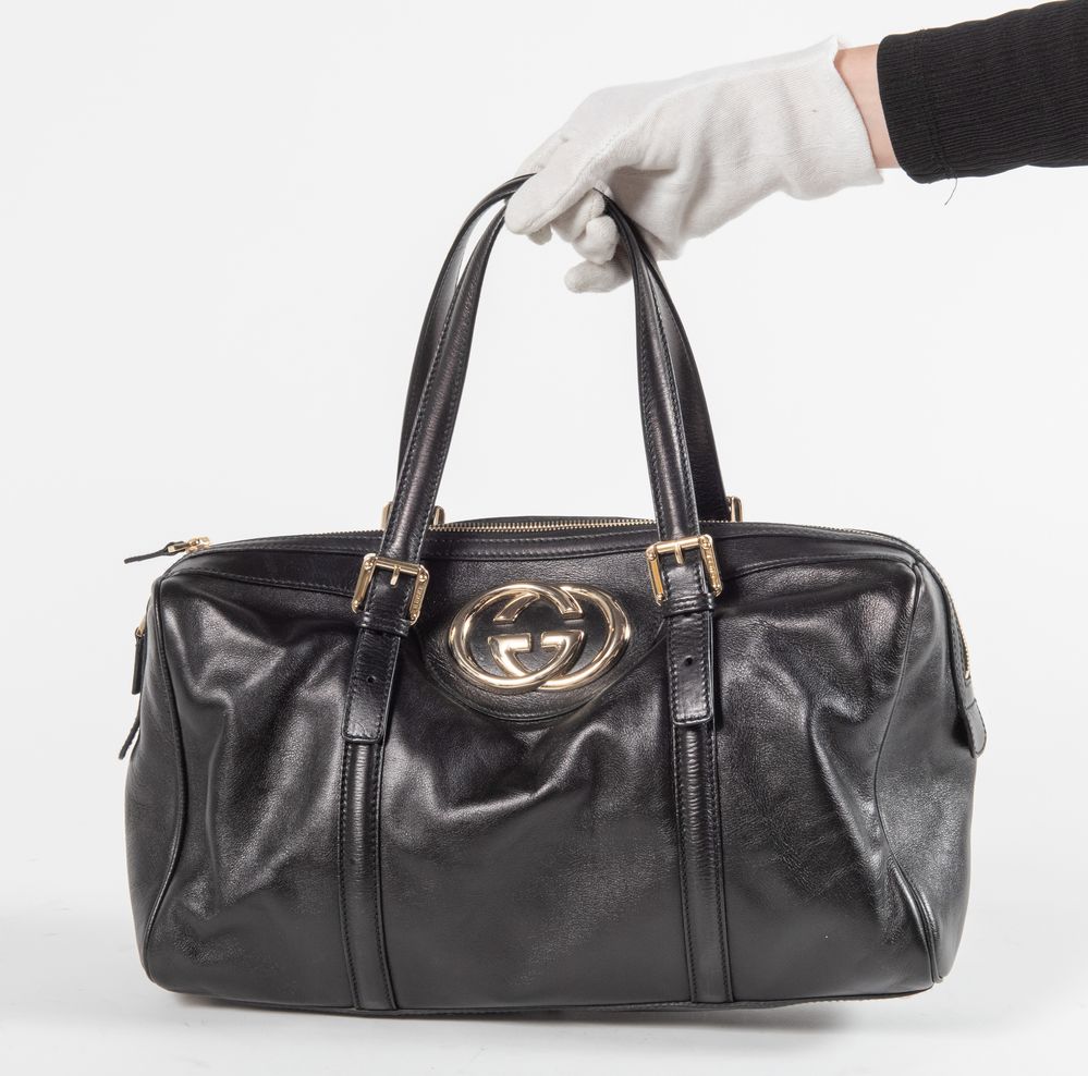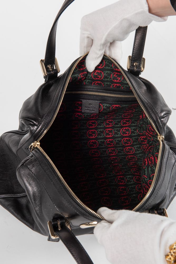 GUCCI Borsa da spalla modello Britt Boston in pelle morbida nera rifinita con dettagli e marchio GG in metallo dorato. Cm 14x30x10. Altezza con manici: cm 38. Interno rivestito in tela interamente logata. Reca marchi GG, Gucci, Gucci Made in Italy e codice di riferimento prodotto.