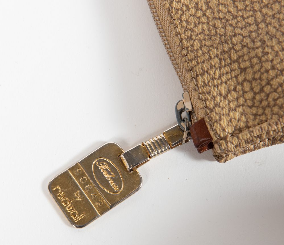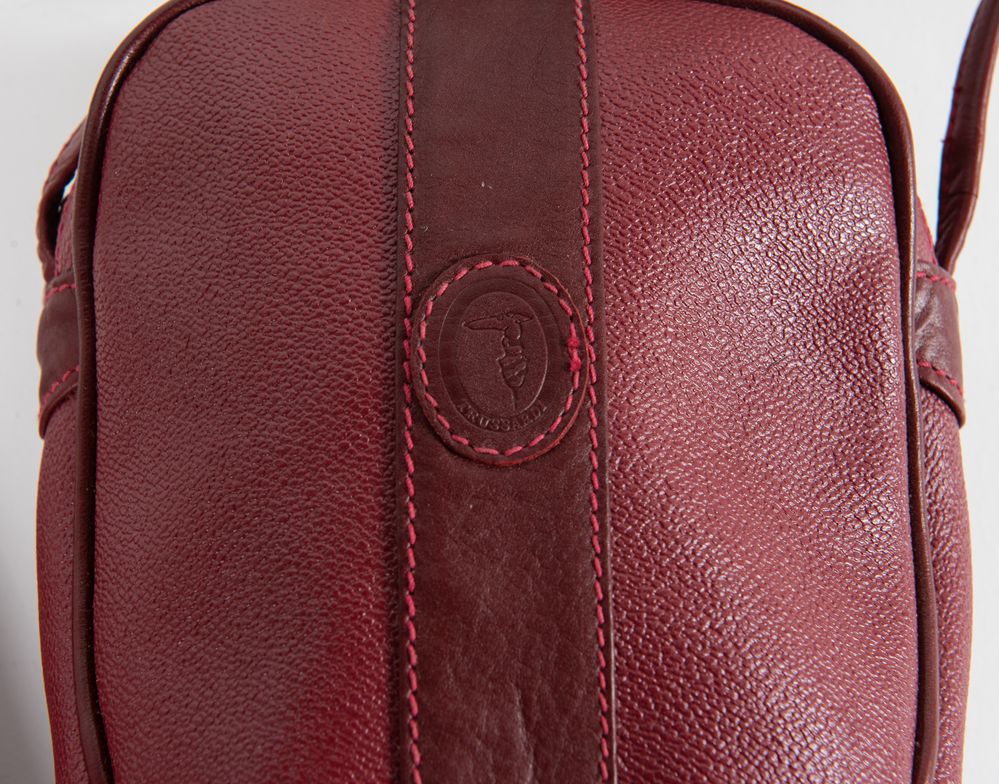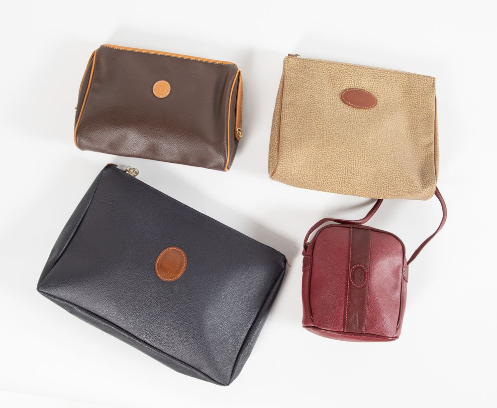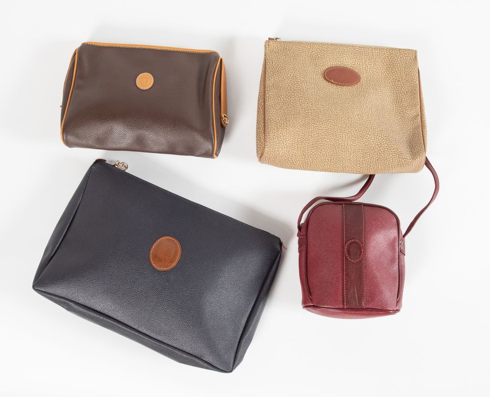 TRUSSARDI, BORBONESE Lotto composto da tre pochette e una piccola borsa a tracolla. Rispettivamente di misure: 19,5x23x5; cm 16x15x5; cm 20x24x8; cm 22,5x31,5x6. Recano marchi Borbonese by Redwall Patented Made in Italy, Trussardi e Trussardi Made in Italy.