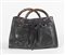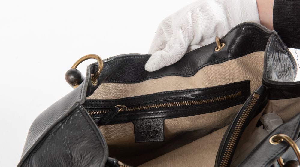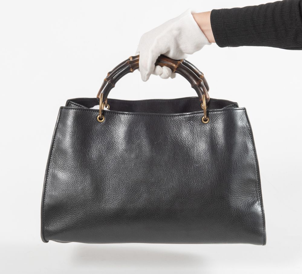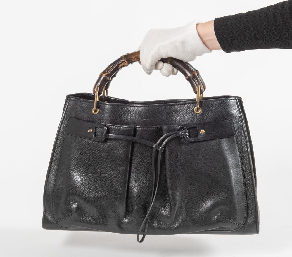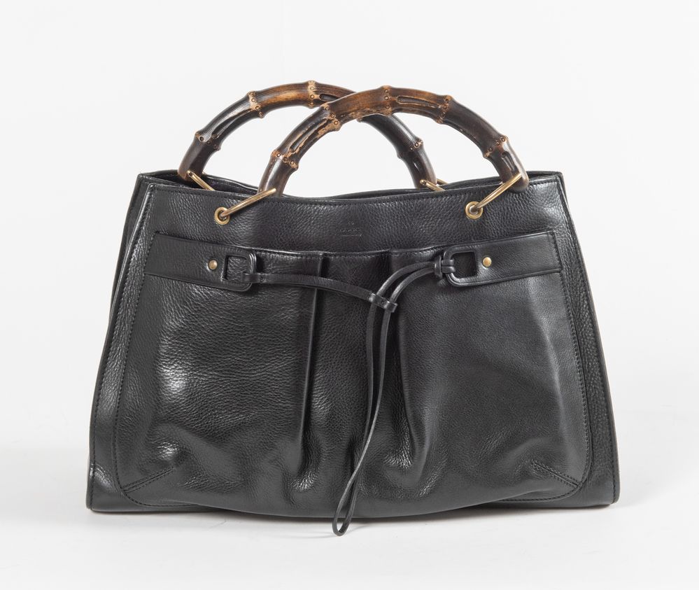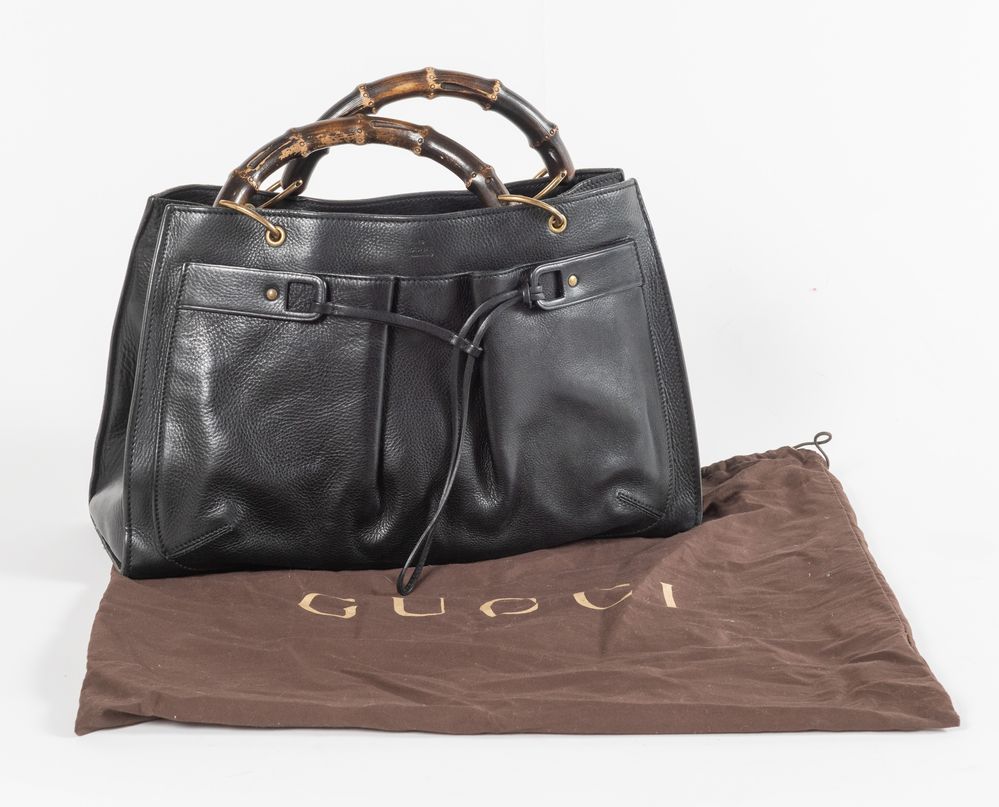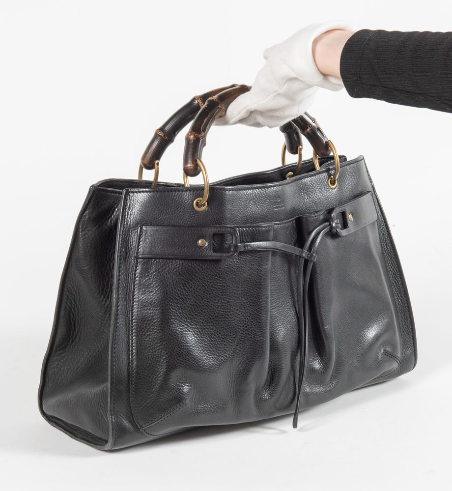 GUCCI Borsa a mano in pelle nera liscia e martellata con tasca frontale con culisse, manici in bamboo e dettagli in metallo dorato. Cm 24x40x16. Altezza con manico: cm 33,5. Interno in tela con rifiniture in pelle con due vani portaoggetti e due tasche chiuse da cerniera. Reca marchi Gucci Made in Italy e codice di riferimento prodotto. Corredata di dustbag originale.