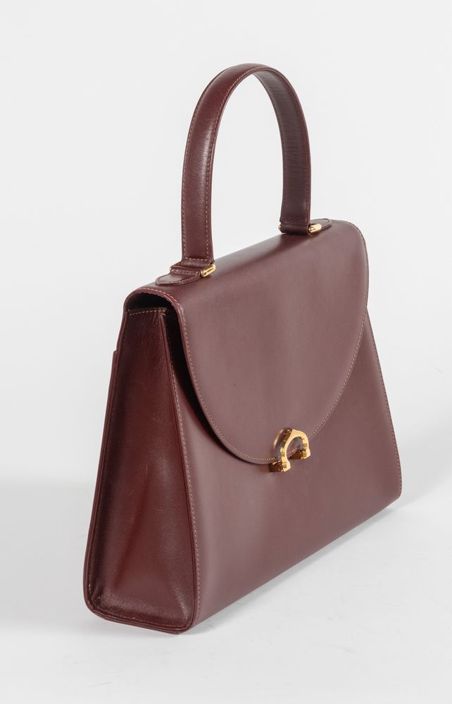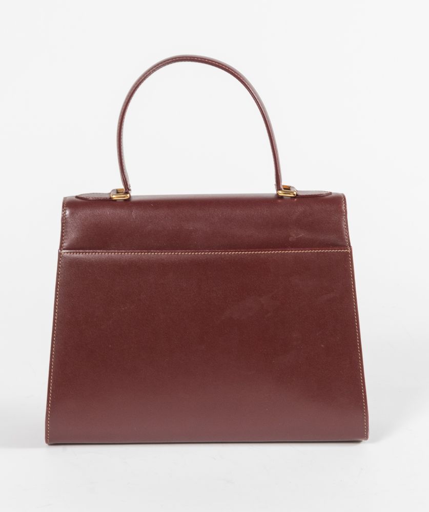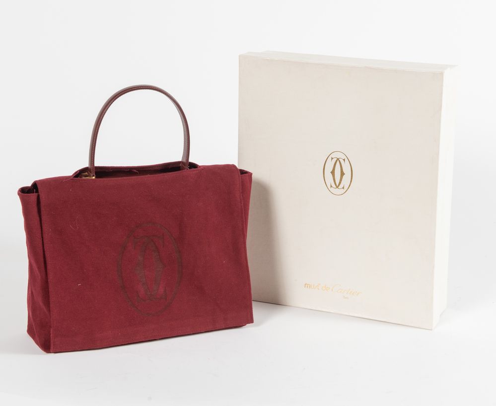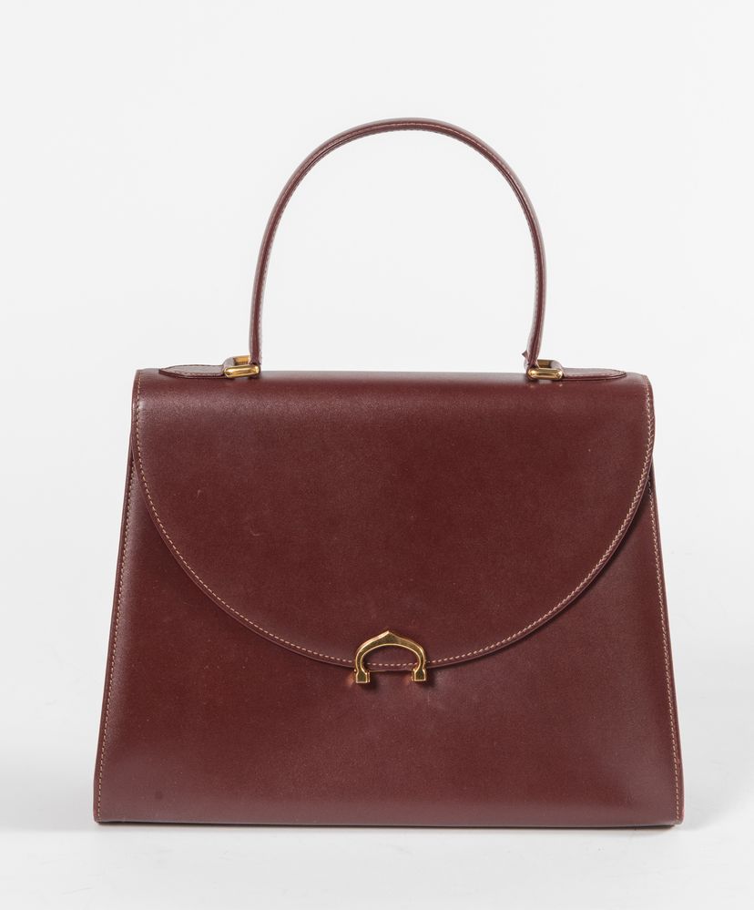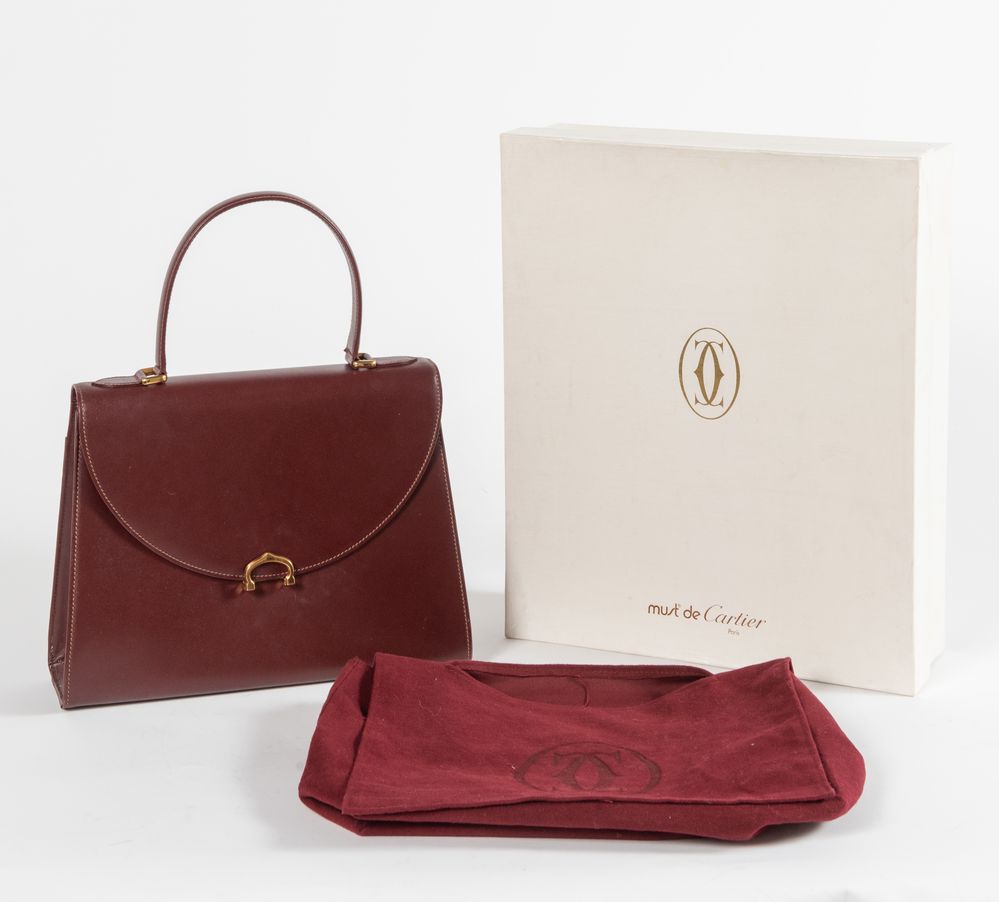 Must de CARTIER Borsa da spalla in pelle liscia bordeaux con dettagli in metallo dorato. Cm 23,5x31,5x10. Altezza con manico: cm 40. Interno in tela logata con tasca chiusa da cerniera. Reca marchi CC, Cartier, Cartier Paris.Corredata di dustbag e scatola originale.