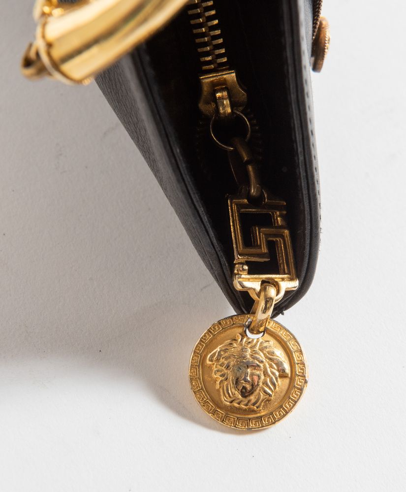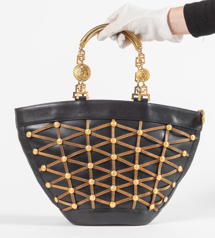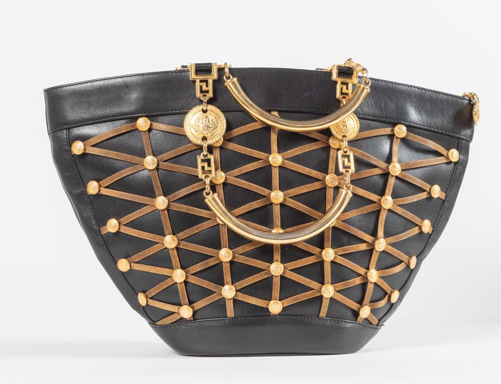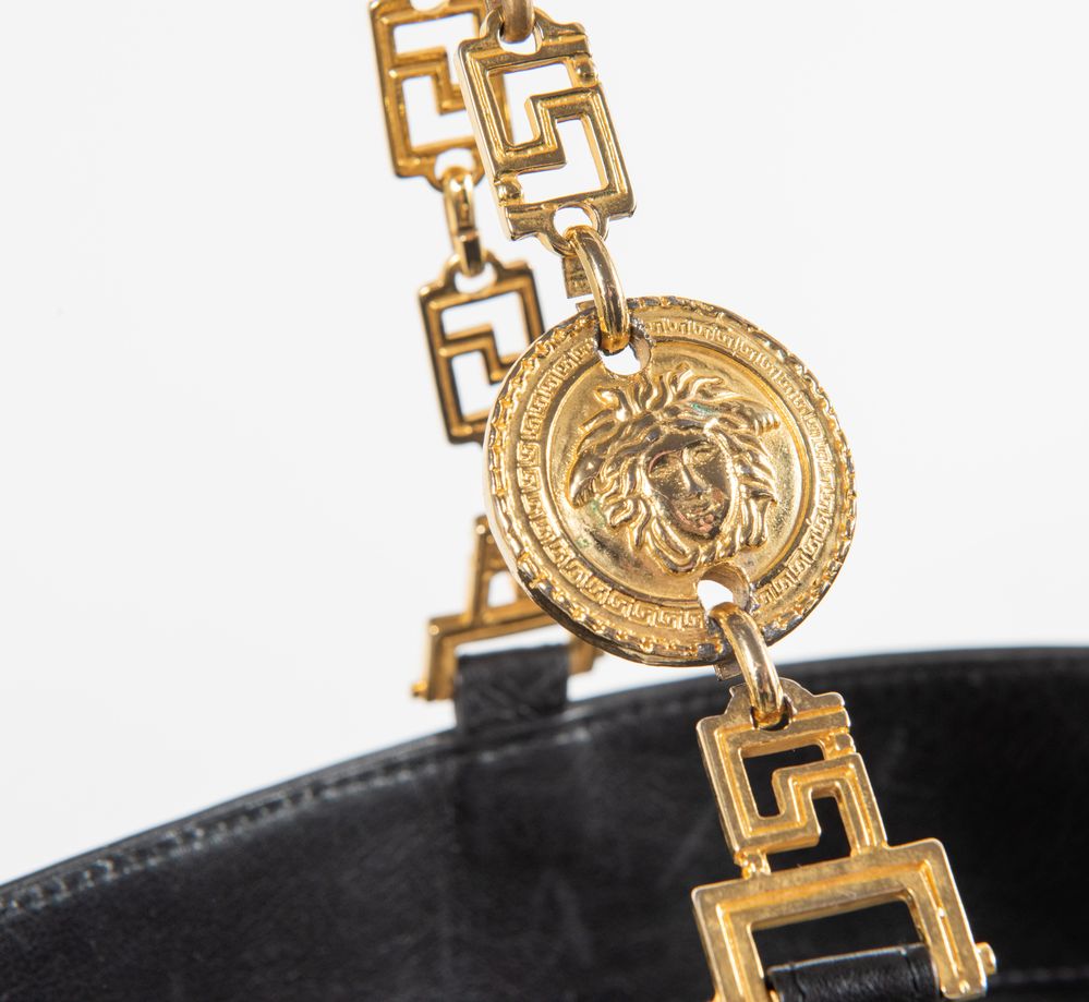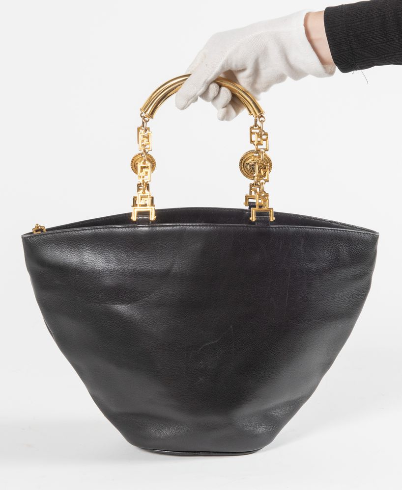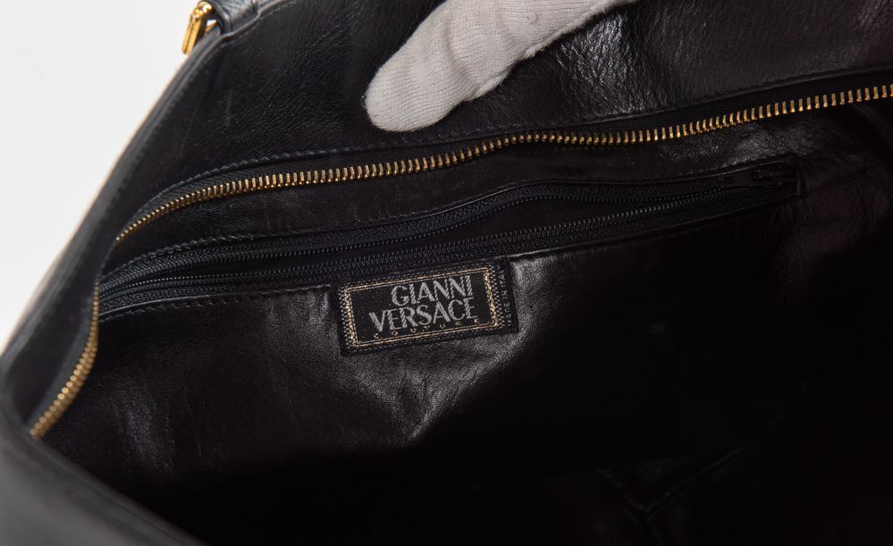 GIANNI VERSACE Borsa in pelle liscia nera con manici, dettagli e rifiniture in metallo dorato. Cm 25,5x42,11. Altezza con manici: cm 40. Interno in pelle nera con tasca chiusa da cerniera. Reca marchi Medusa e Gianni Versace Couture.
