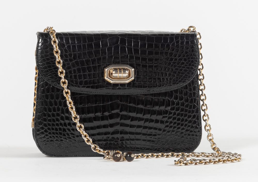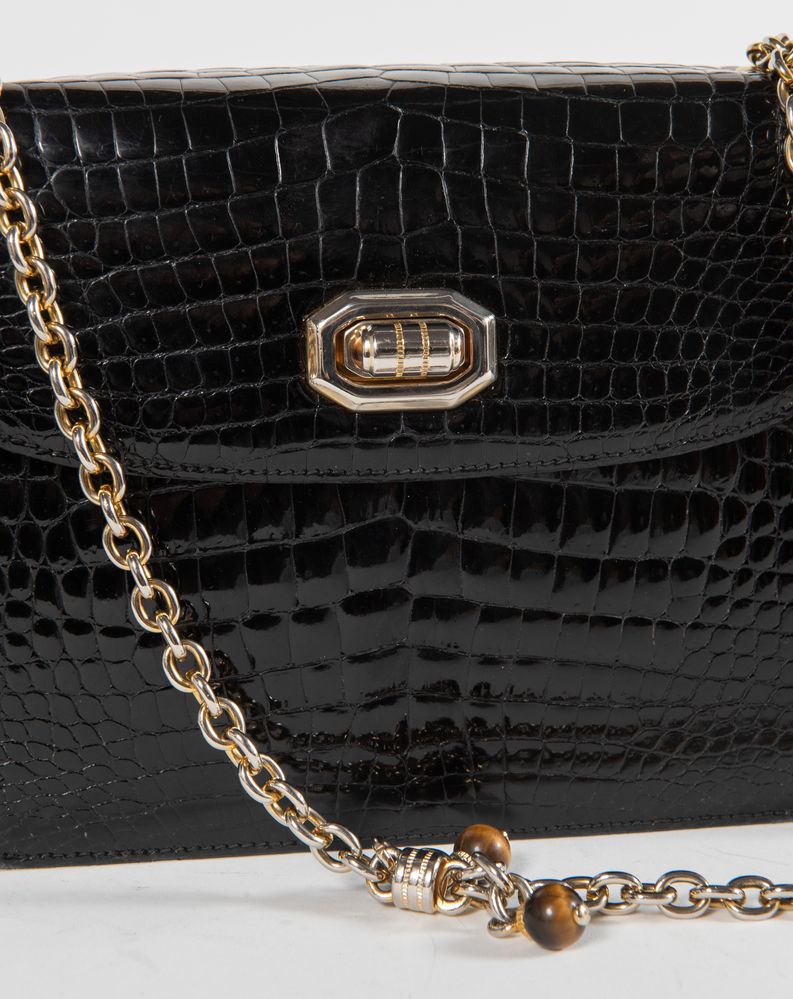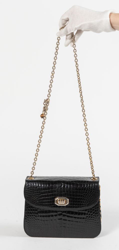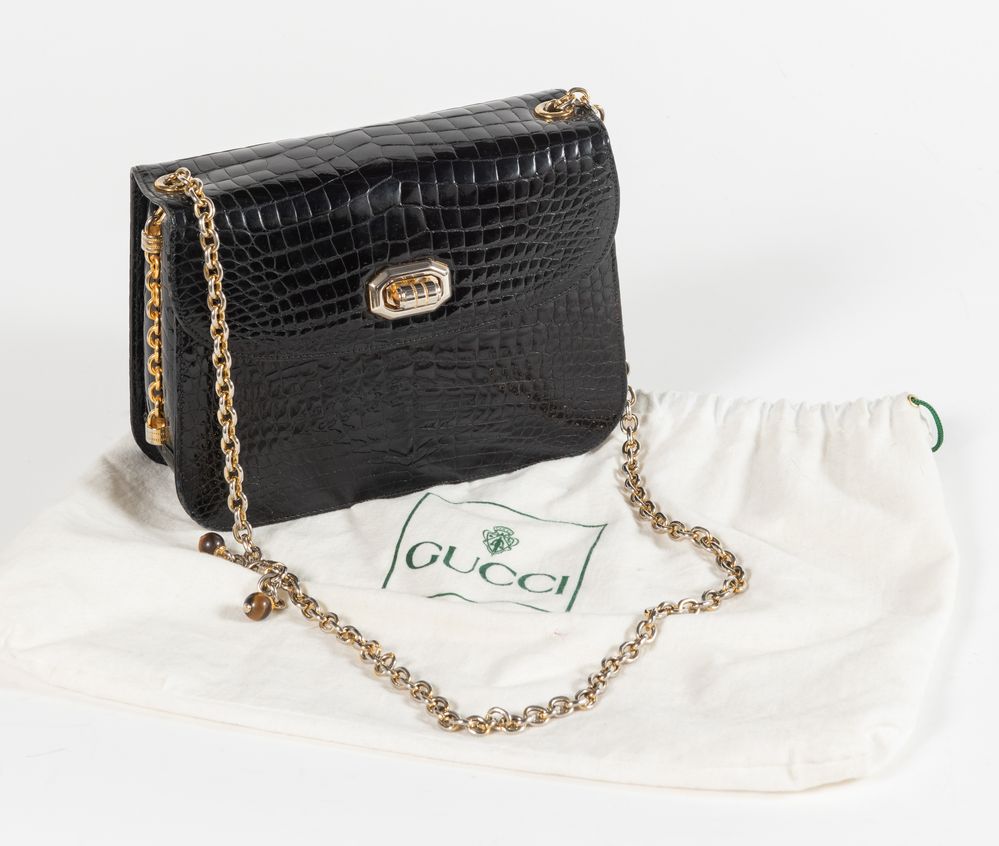 GUCCI Borsa da spalla in pelle di coccodrillo nera con manico a catena e rifiniture in metallo dorato. Collezione anno 1969. Cm 17x22x9,5. Altezza con manico: cm 60. Interno in pelle nera con tre tasche di cui una chiusa da cerniera. Reca marchi Gucci Made in Italy e Cavaliere. Corredata di dustbag originale.