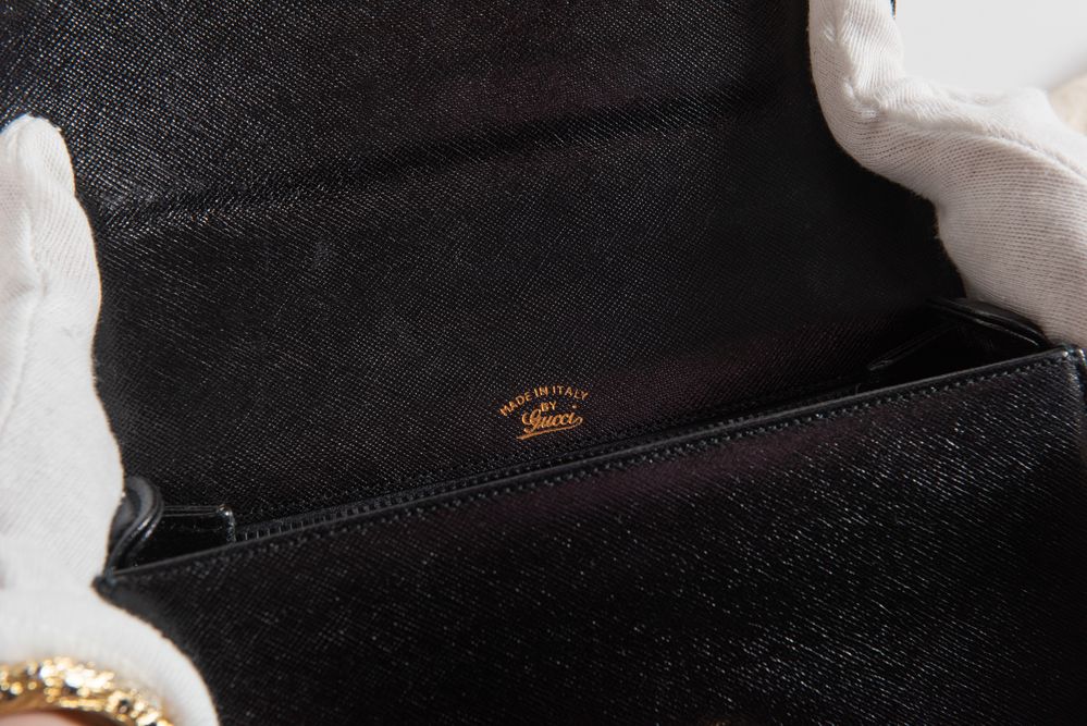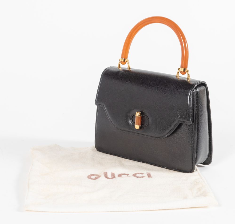 GUCCI Borsa a mano in pelle con manico e chiusura in bachelite. Anni '70 ca. Cm 18x23,5x7. Altezza con manico: cm 28,5. Interno rifinito in pelle con tre vani portaoggetti e una taschina con cerniera. Reca marchi Gucci, Made in Italy by Gucci e Cavaliere. Corredata di dustbag.