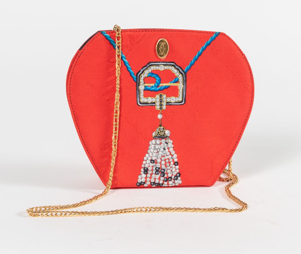 Must de CARTIER Borsa da spalla esagonale in seta con disegno su fondo rosso....