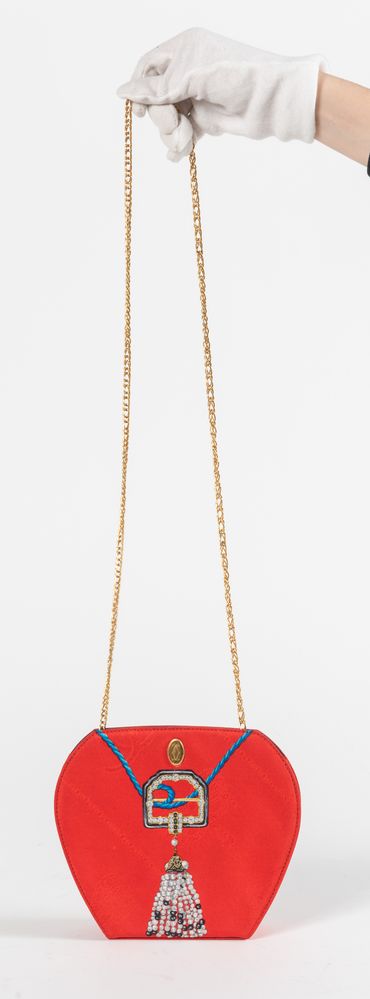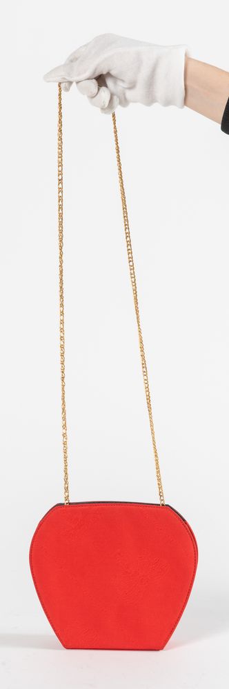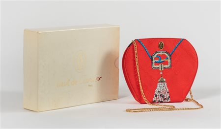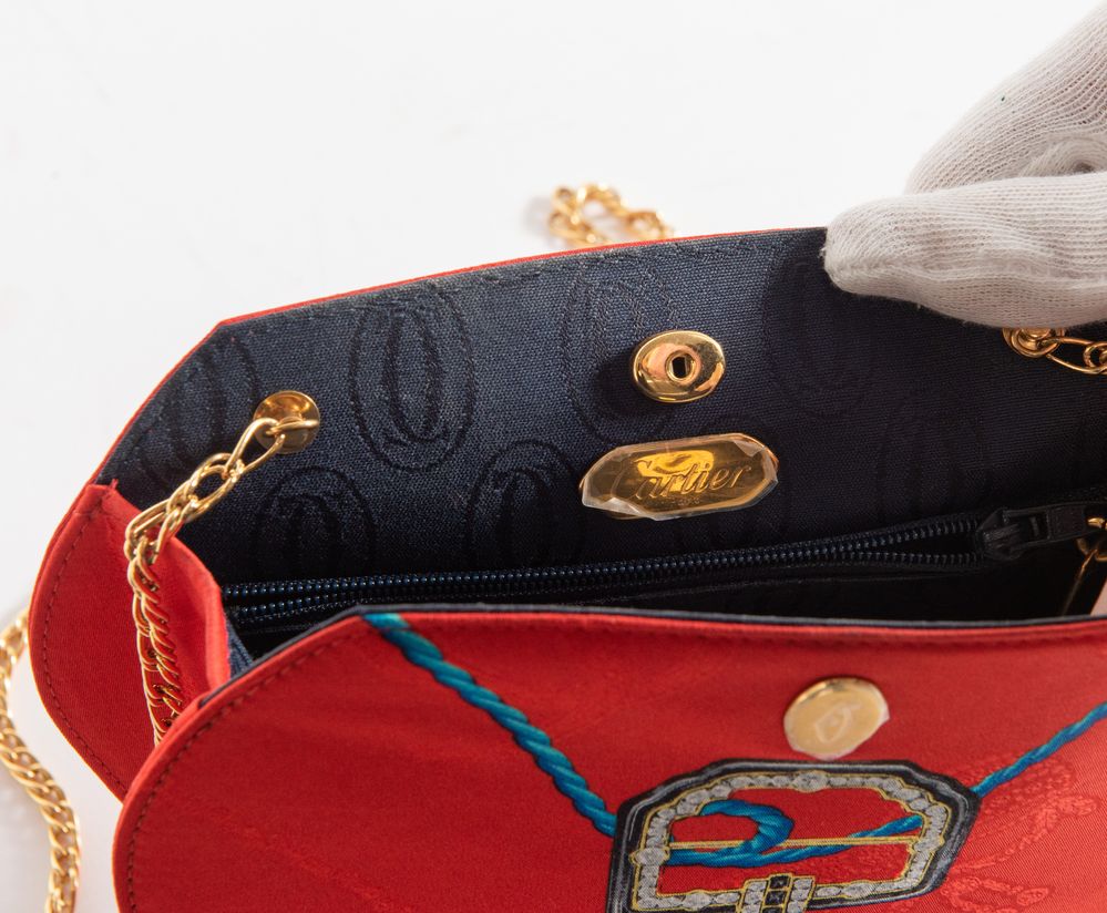 Must de CARTIER Borsa da spalla esagonale in seta con disegno su fondo rosso. Manico a catenella da portare doppia o singola e dettagli in metallo dorato. Anni '80. Cm 17,5x20,5x5. Lunghezza massima manico: cm 105. Interno in tela logata blu con tasca chiusa da cerniera. Reca marchi CC, Cartier, Cartier Paris. Corredata di certificato e scatola originali.