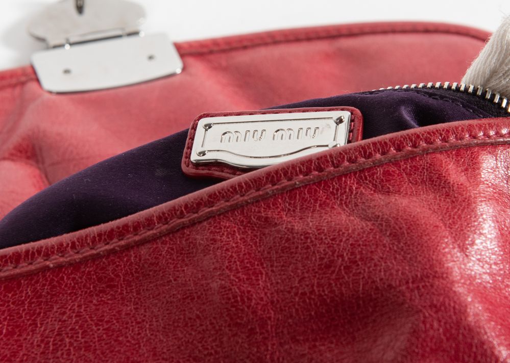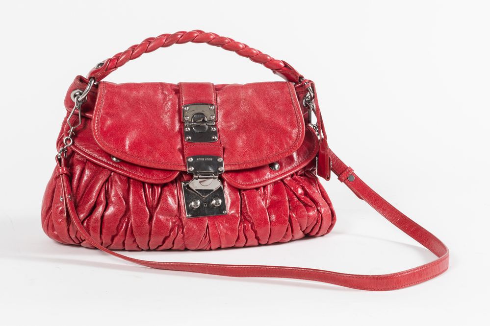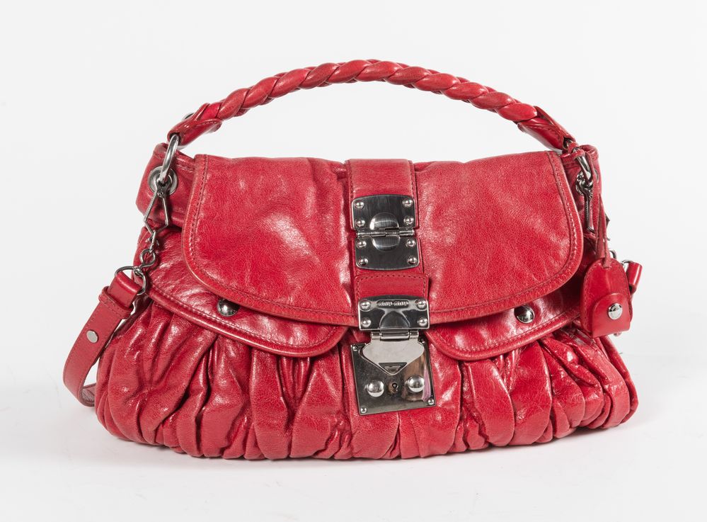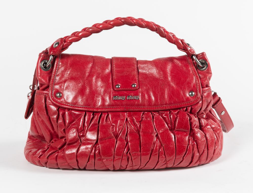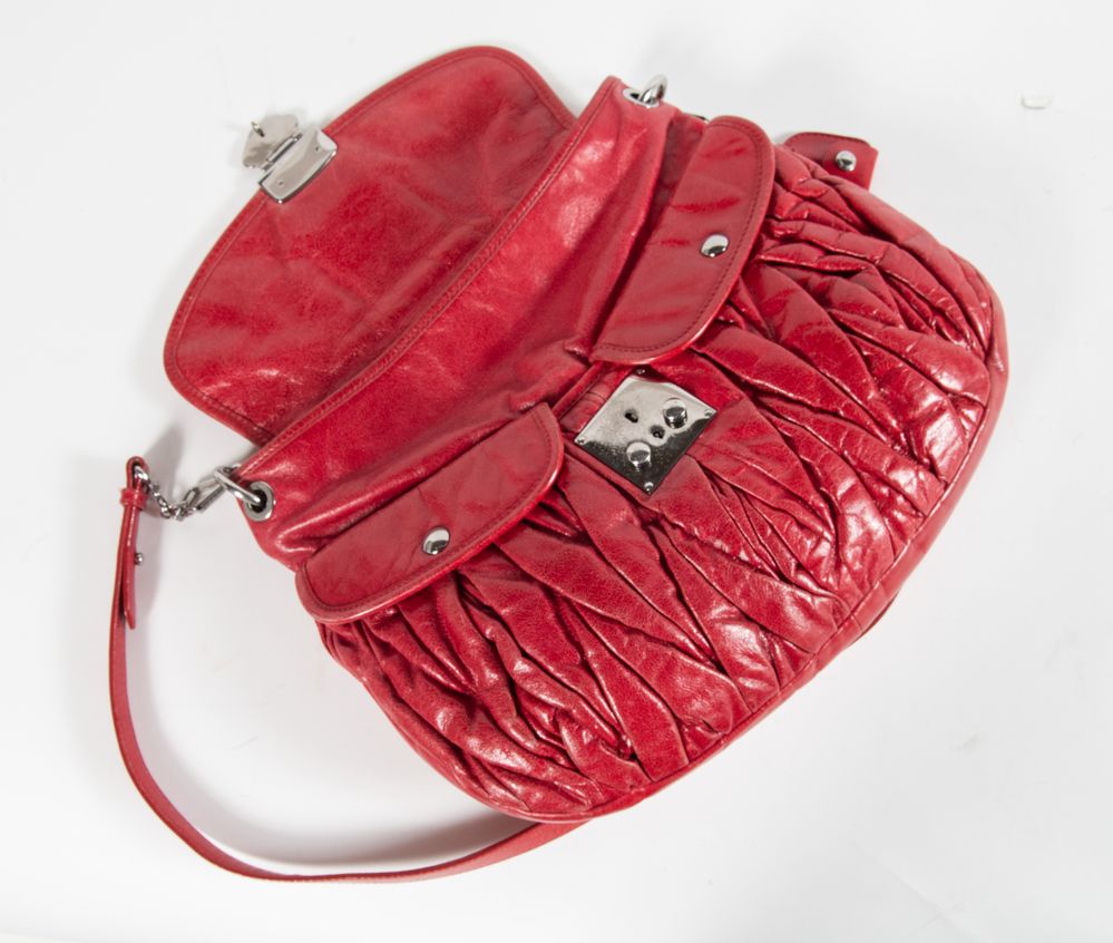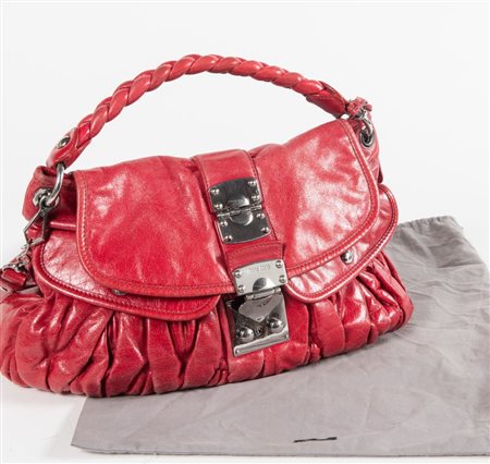 MIU MIU Borsa da spalla in pelle rossa liscia e arricciata con dettagli e rifiniture in metallo argentato. Modello Matelassé Coffer. Cm 30x39,5x8. Altezza con manico: cm 42. Sotto la patta presenta due tasche chiuse da bottone automatico. Interno in tela con tasca chiusa da cerniera. Reca marchi Miu Miu. Corredata di dustbag originale. (Lievissimi difetti)
