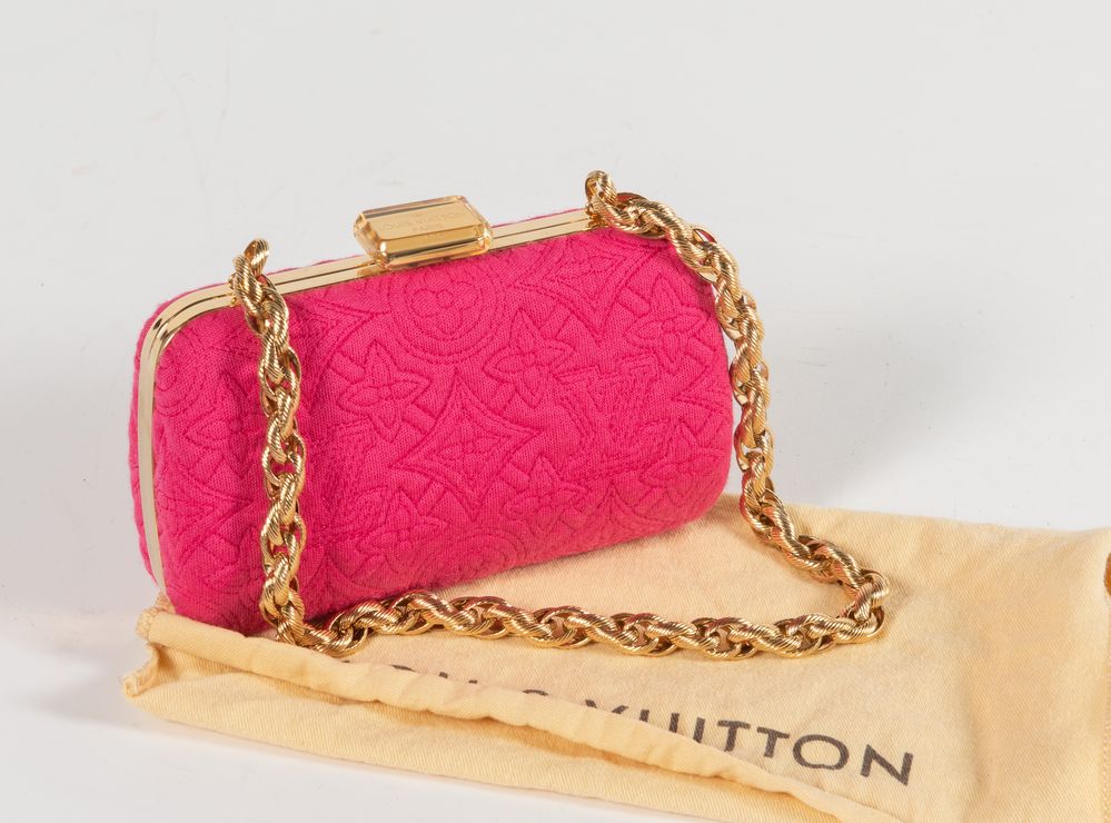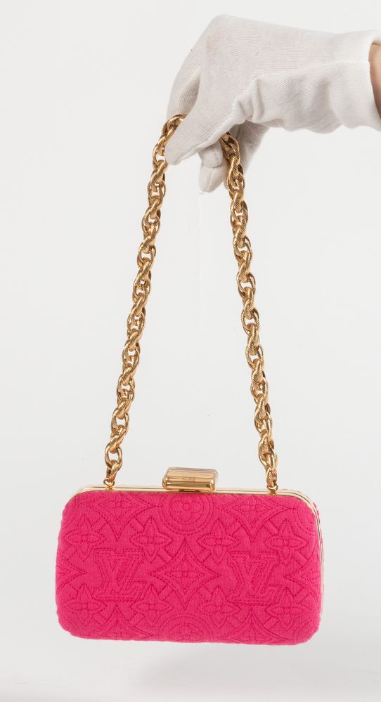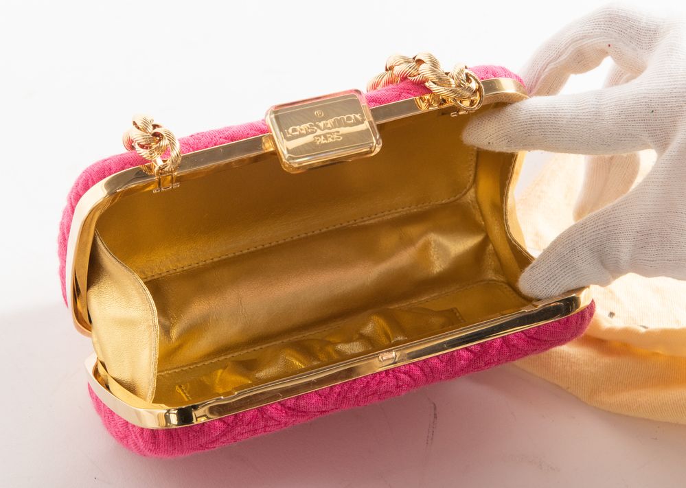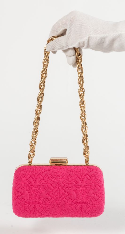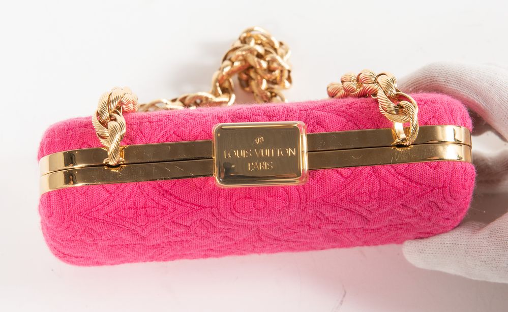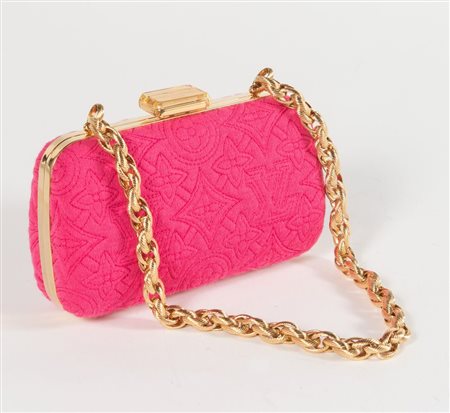 LOUIS VUITTON Borsa clutch modello Jersey Motard Minaudiere in tela trapuntata monogram fucsia con manico e rifiniture in metallo dorato. Collezione anno 2008. Cm 11x17x5,6. Altezza con manico: cm 35,5. Interno in pelle color oro con piccola taschina. Reca marchi Louis Vuitton Paris Made in France e codice di riferimento prodotto. Accompagnata da etichetta con codice e modello riportati. Corredata di dustbag originale. (Lievissimi difetti)
