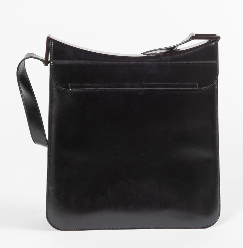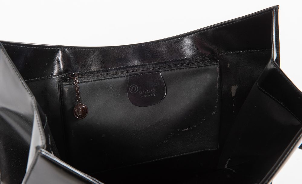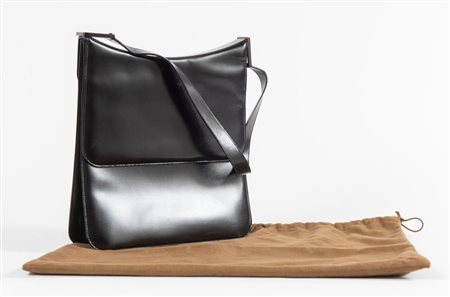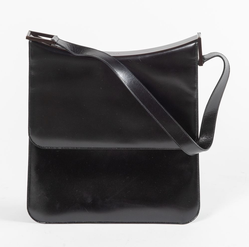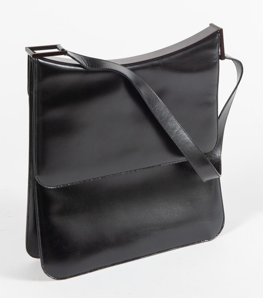 GUCCI Borsa da spalla in pelle liscia nera. Cm 33x29,5x7,5. Altezza con manico: cm 61. Interno in pelle con tasca chiusa da cerniera. Reca marchi Gucci, Gucci Made in Italy e codice di riferimento prodotto. Corredata di dustbag originale. (Difetti)