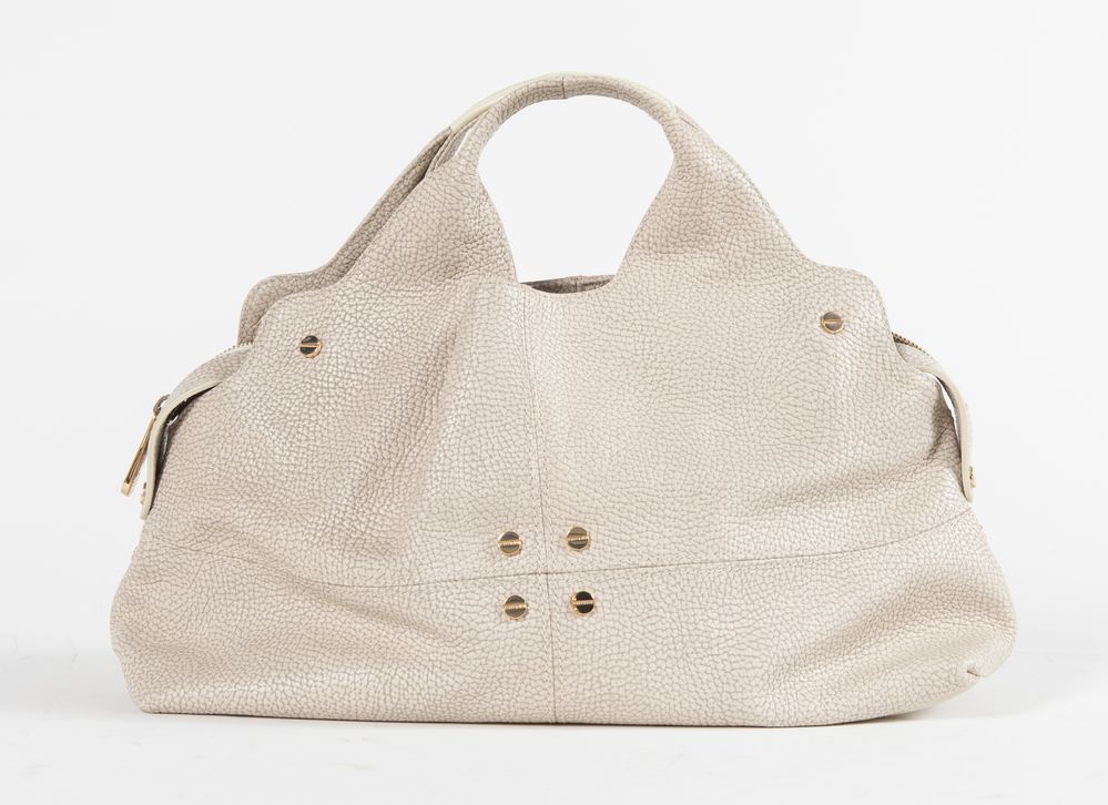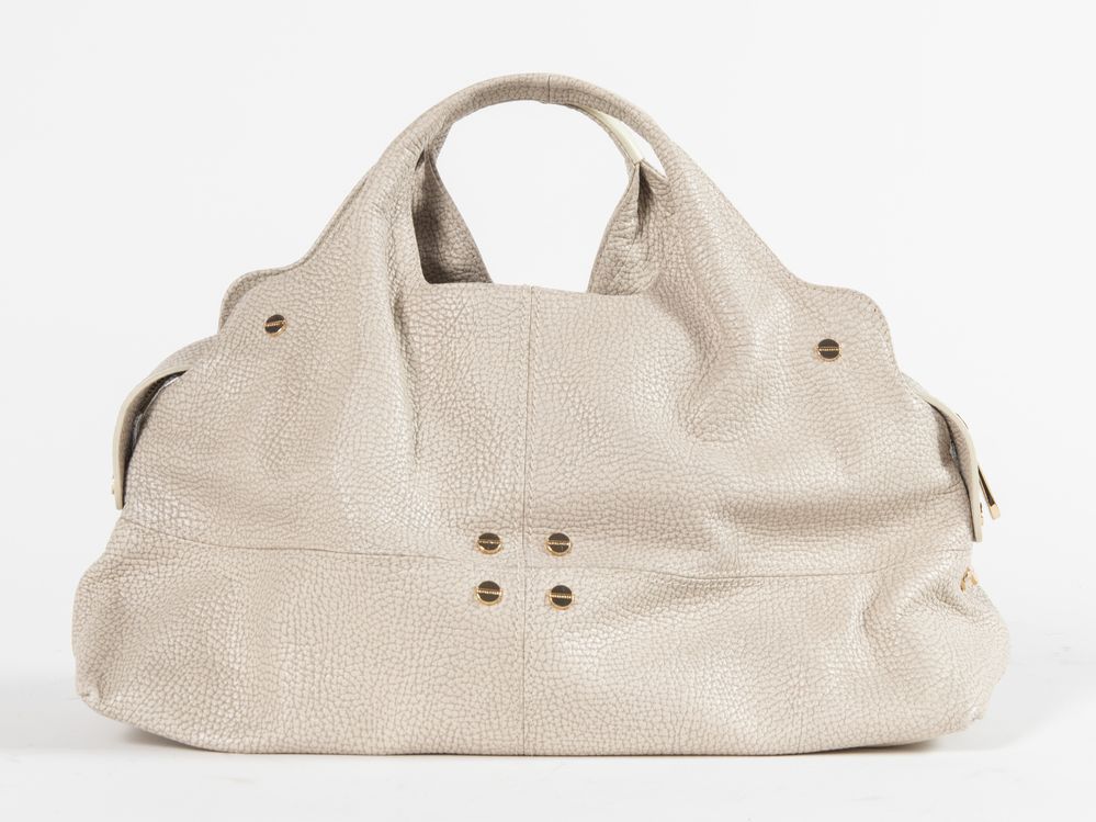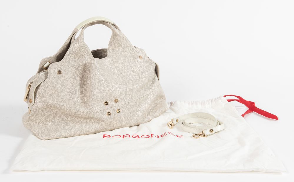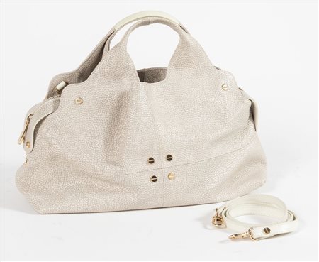 BORBONESE Borsa a mano in pelle martellata color panna/grigio chiaro con rifiniture in metallo dorato. Cm 32x37x18. Tracolla rimovibile di cm 120. Interno in tela e pelle con vari vani portaoggetti di cui due chiusi da cerniera. Reca marchi Borbonese ed etichetta Made in Italy con codice di riferimento prodotto. Accompagnata da certificato Borbonese e corredata di dustbag originale.