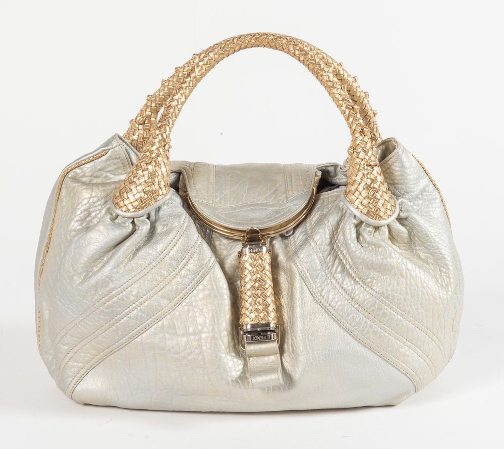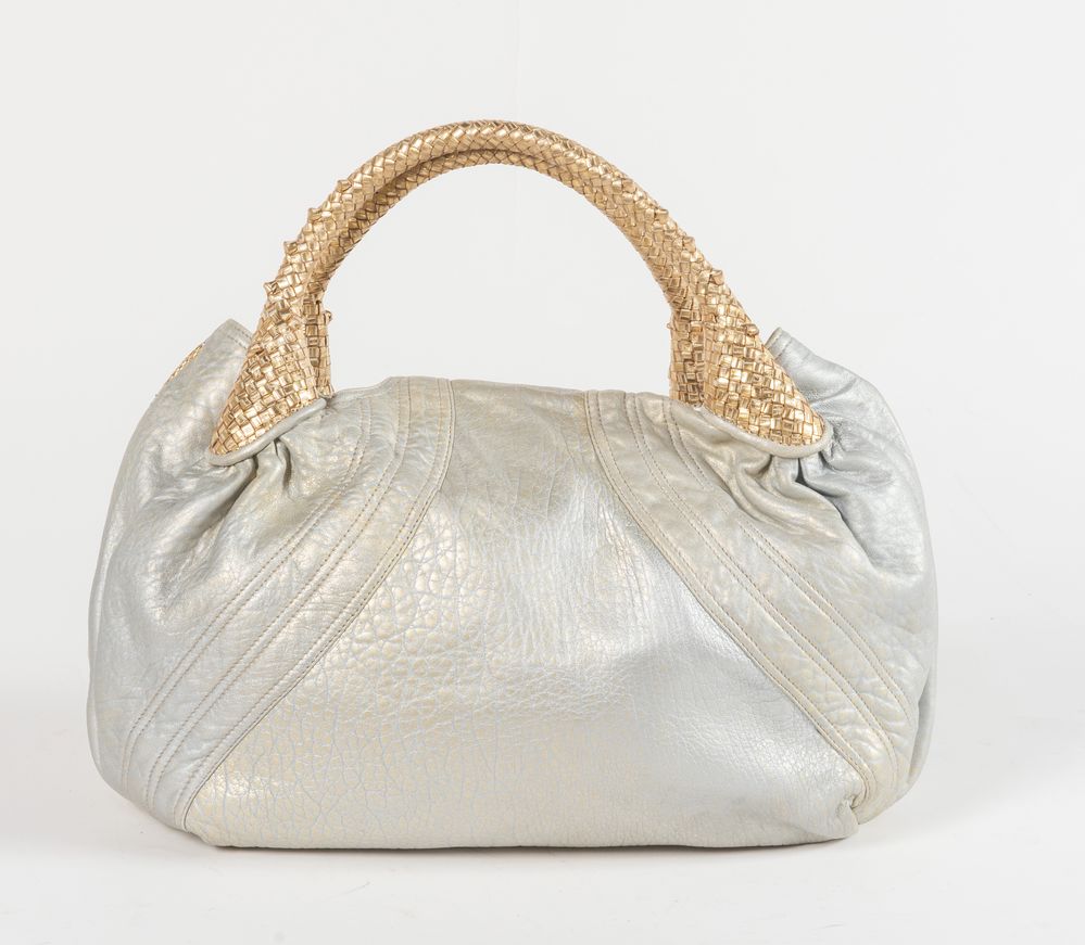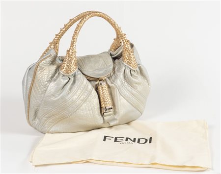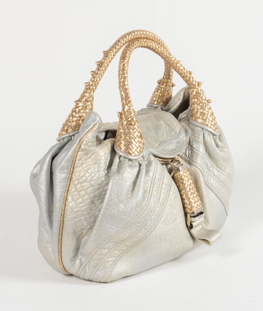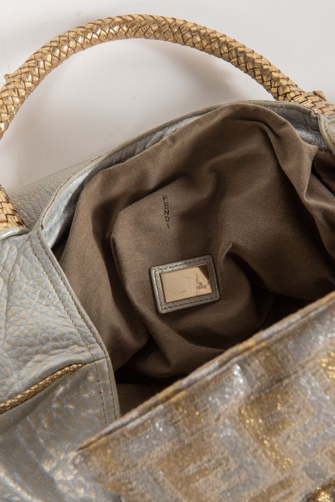 FENDI Borsa a mano modello Spie in pelle oro e argento cangiante. Dettagli e rifiniture in metallo dorato e argentato. Interno in tela beige logata con borsellino annesso. Cm 30x42x16. Altezza con manico: cm 42. Reca marchi FF, Fendi, Made in Italy ed etichette con codice di riferimento prodotto. Corredata di dustbag originale.