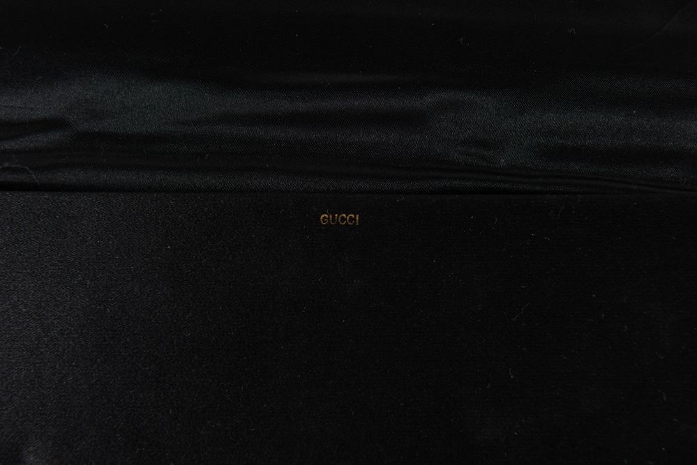 GUCCI Pochette in seta nera. Cm 14,5x21x3,5. Reca marchio Gucci. Corredata di dustbag. (Difetti)