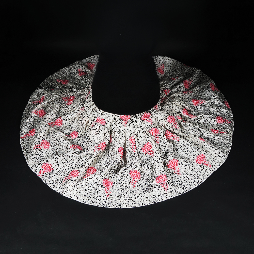 Balenciaga gonna a balze in tessuto misto seta a fondo avorio con pois neri e rose; elastico nero in vita, tg. 38 (marca presente solo nell'etichetta della composizione)