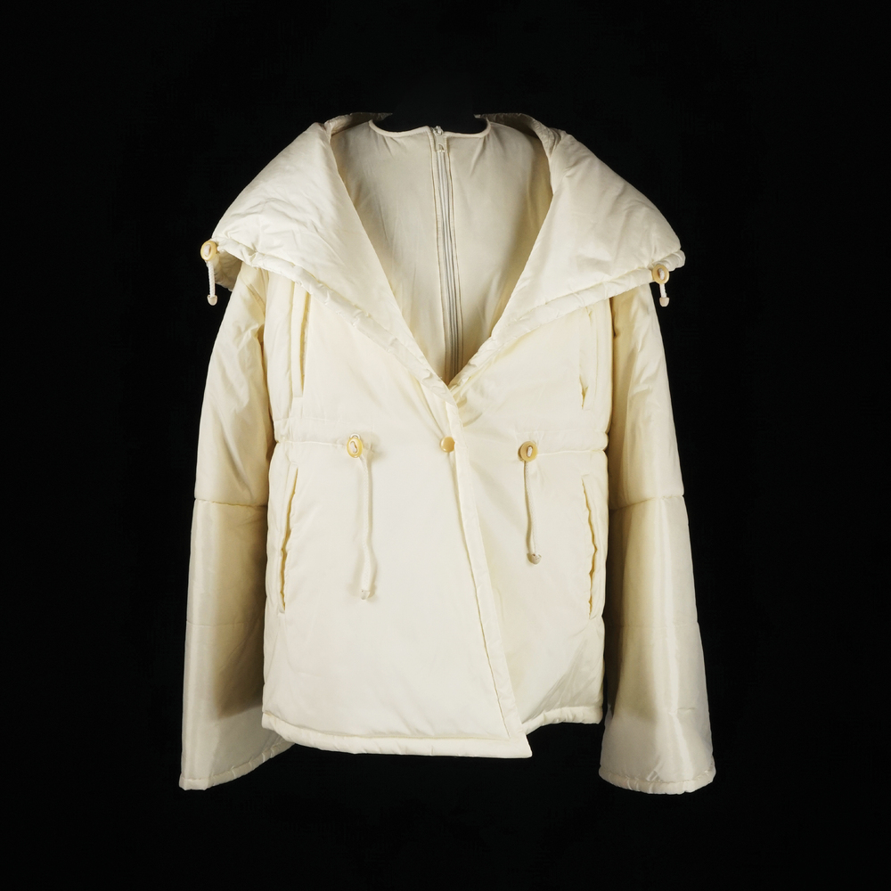 Claude Montana parka in tessuto tecnico imbottito color avorio con ampio collo; sottostante giacchino in pendant, tg. 40/6