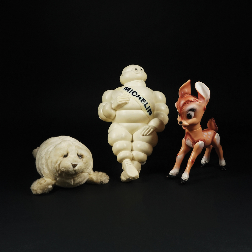 Bibendum Michelin in plastica bianca/avorio, 1966, h. cm. 49 UNITO a un Bambi della Walt Disney in plastica colorata con gambe mobili, cm. 36x29 e a una foca in peluche bianco/avorio della marca Lou Rankin Friends, l. cm. 48