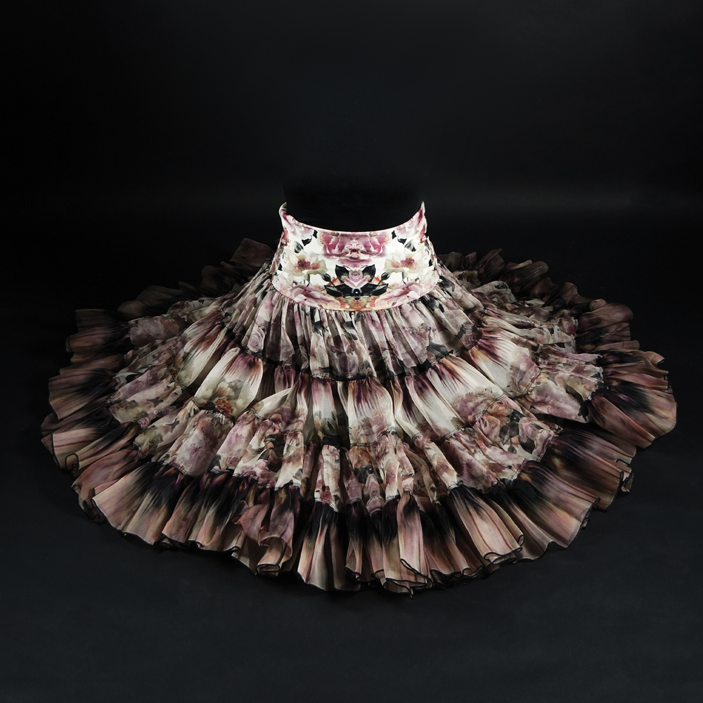 Jaen Paul Gaultier Maille Femme gonna a balze in tessuto misto seta a fondo avorio a stampa policroma raffigurante una moltitudine di rose e boccioli, tg. S