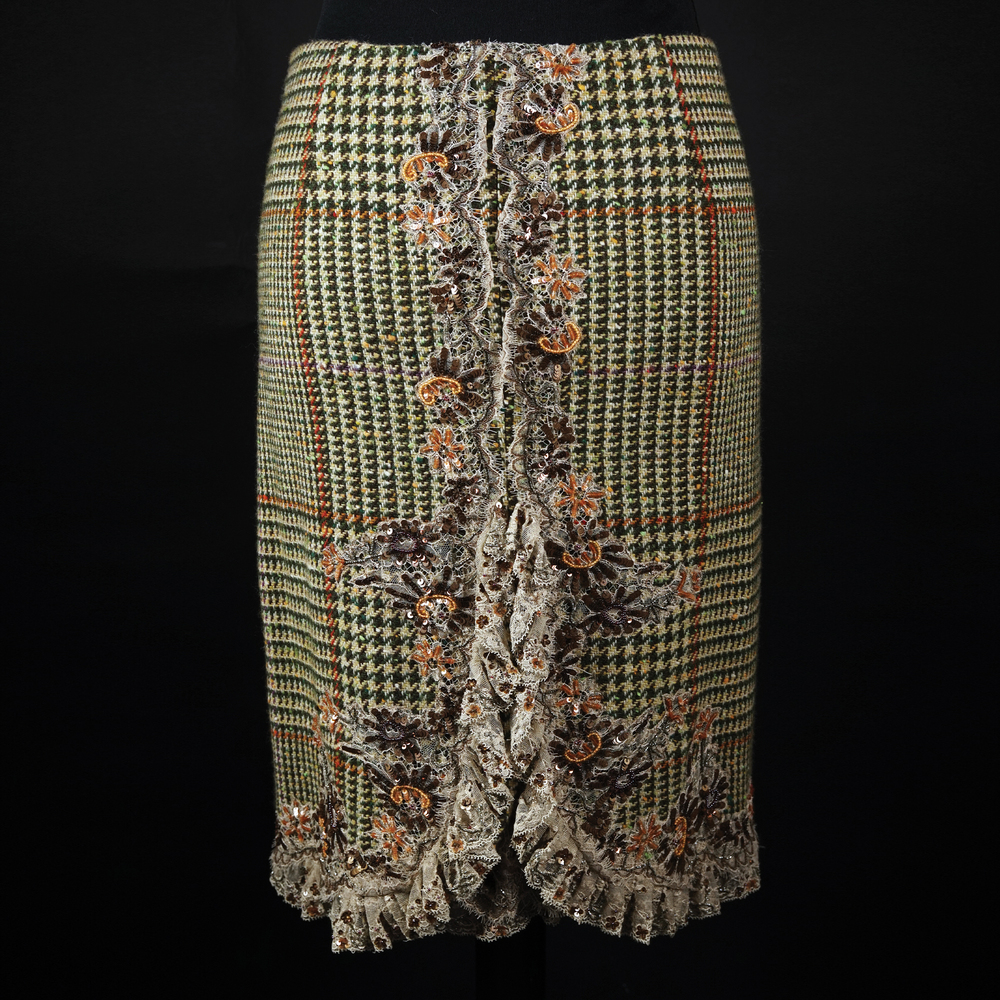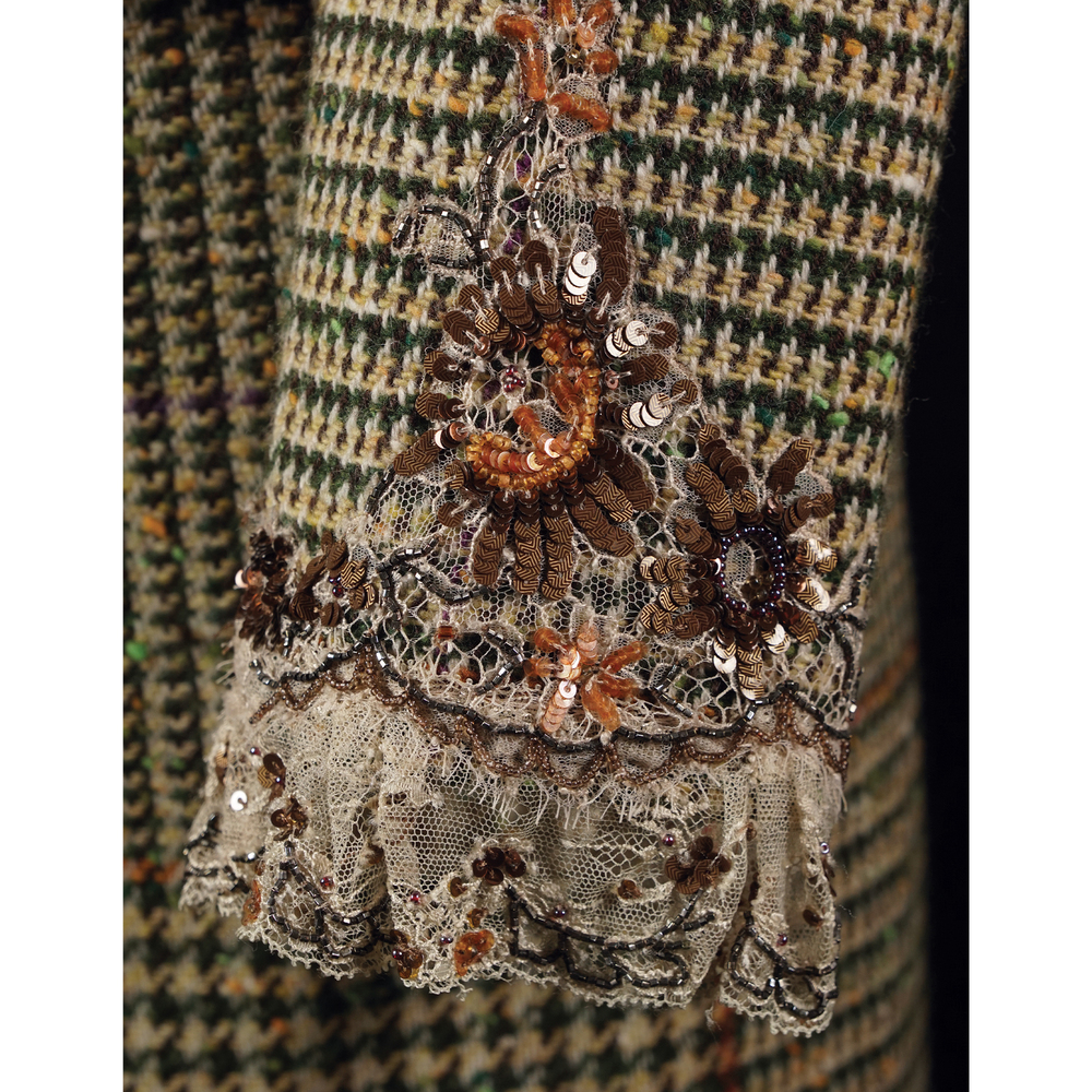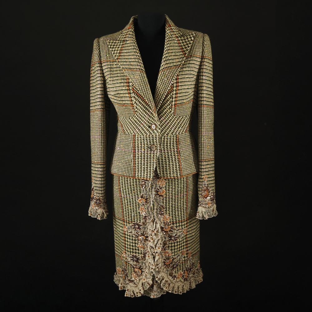 Valentino tailleur in lana principe di Galles verde e avorio; i bordi delle maniche e della gonna abbelliti da applicazioni floreali in paillettes e perline colorate su tulle. Composto da una gonna, tg. 12 e una giacca, tg. 8