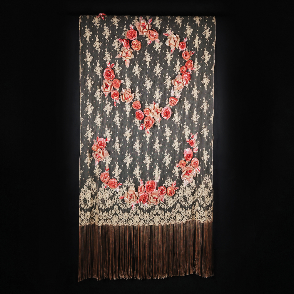 Valentino (attr.) stola di pizzo color albicocca con frange, arricchite da rami di rose di seta e paillettes nei toni del rosa, cm. 250x95 circa complessivamente