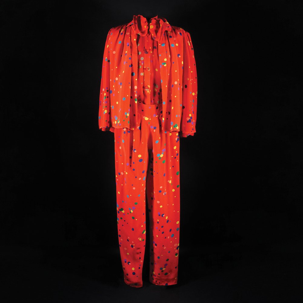Valentino completo in voile di seta rosso a pois colorati composto da giacca, camicia a maniche corte con fiocco sul collo e pantaloni