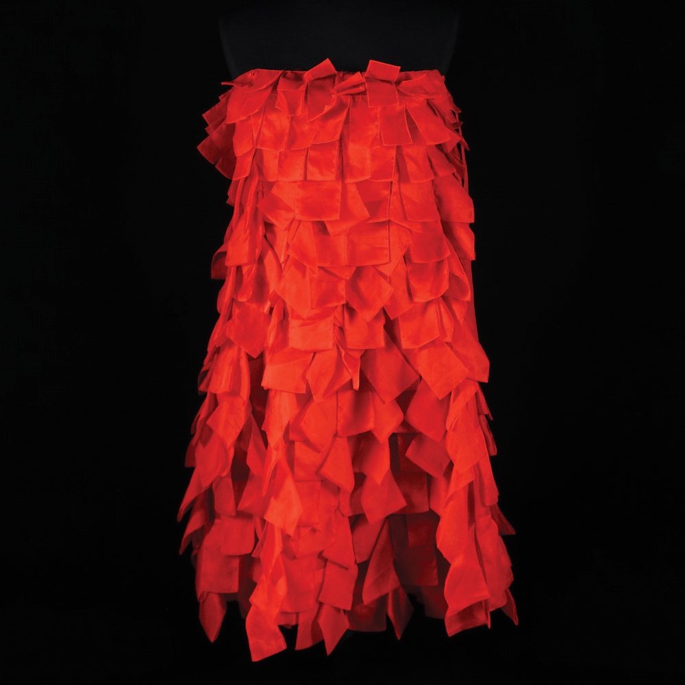 Valentino abito in organza di seta rossa tagliata a nastri ripiegati, tg. 8.