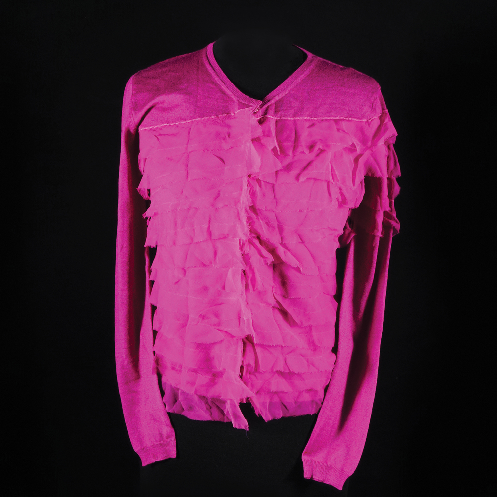 Christian Dior cardigan in misto lana, cashmere e seta fucsia con balze sul davanti, tg. F 38