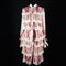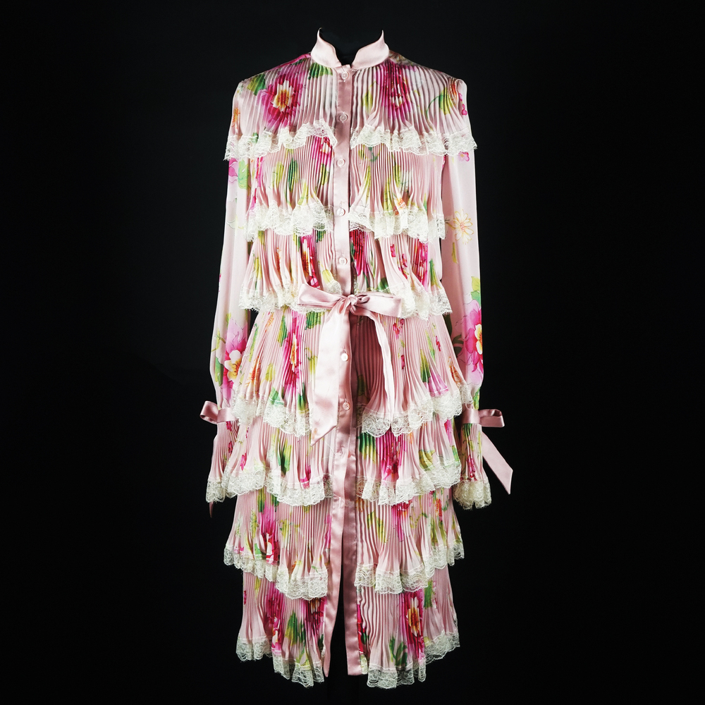 Valentino chemisier di seta a fondo rosa a stampa fiorata; il davanti abbellito da balze plissettate bordate di pizzo avorio.