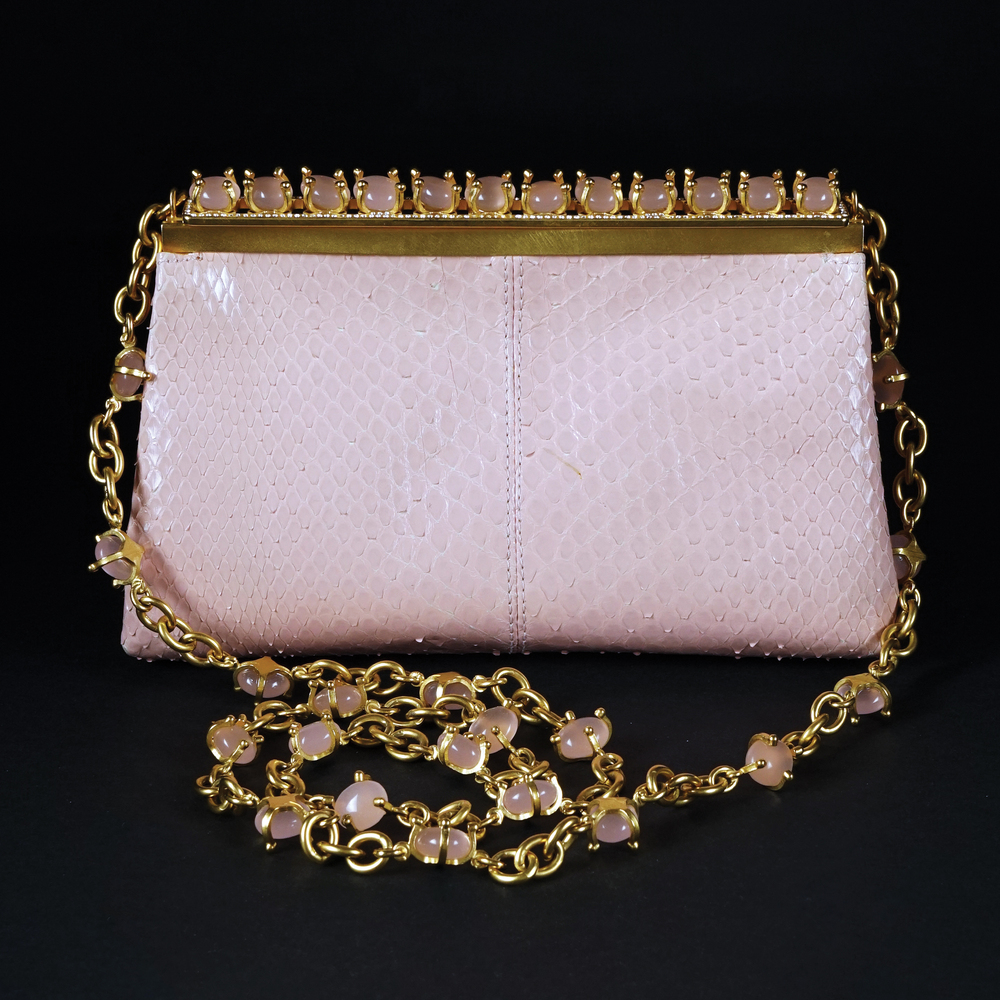 Valentino borsetta gioiello in pelle pitonata rosa con tracolla e chiusura in metallo dorato arricchite da pietre rosa cabochon