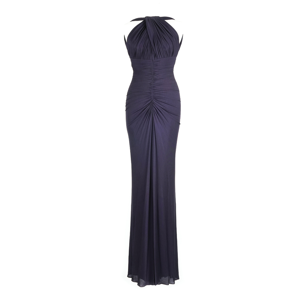 Herve L. Leroux abito lungo senza maniche in viscosa elasticizzata viola drappeggiato sul davanti