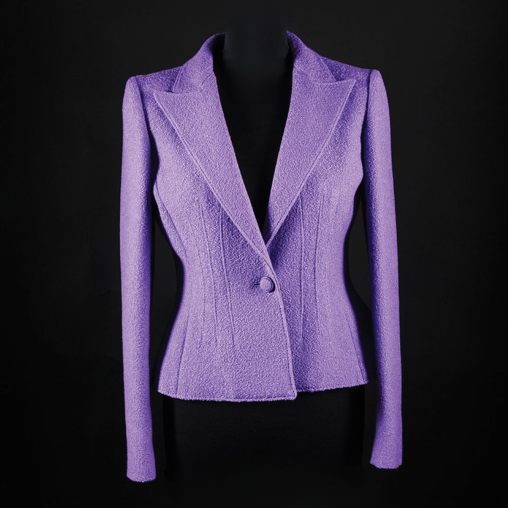 Valentino giacca in lana bouclé viola con nervature impunturate, tg. 6