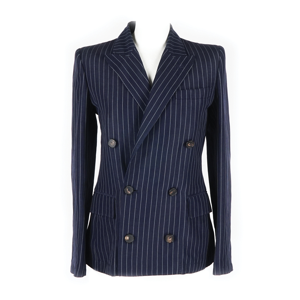 Jean Paul Gaultier blazer doppio petto in misto lana e lino gessato a fondo blu, tg. I 42