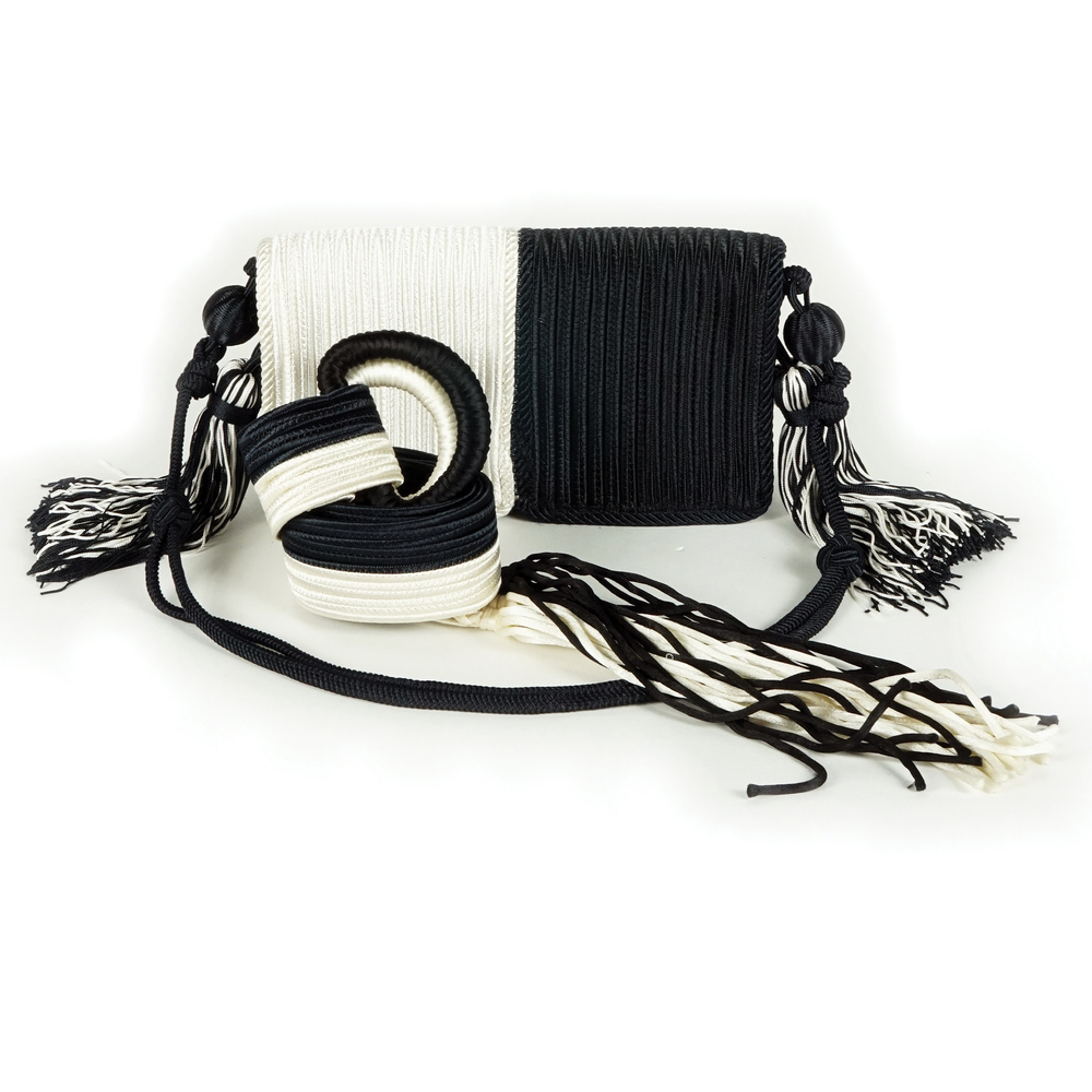 Yves Saint Laurent borsetta in passamaneria blu, nera e bianca; cintura en pendant