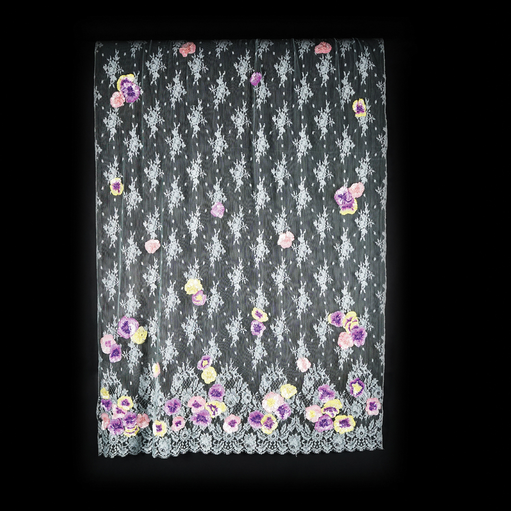 Valentino stola di pizzo celeste con fiori di rosa e boccioli di paillettes nei toni del giallo, rosa e violetto, cm. 185x95 circa
