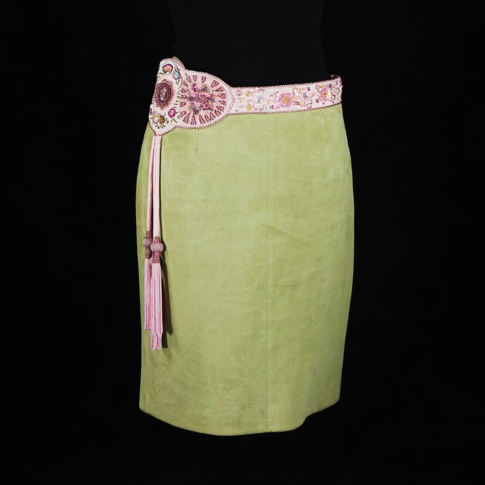 Valentino gonna di camoscio verde acqua con cintura in raso rosa interamente ricamato a motivi floreali, tg. 6.