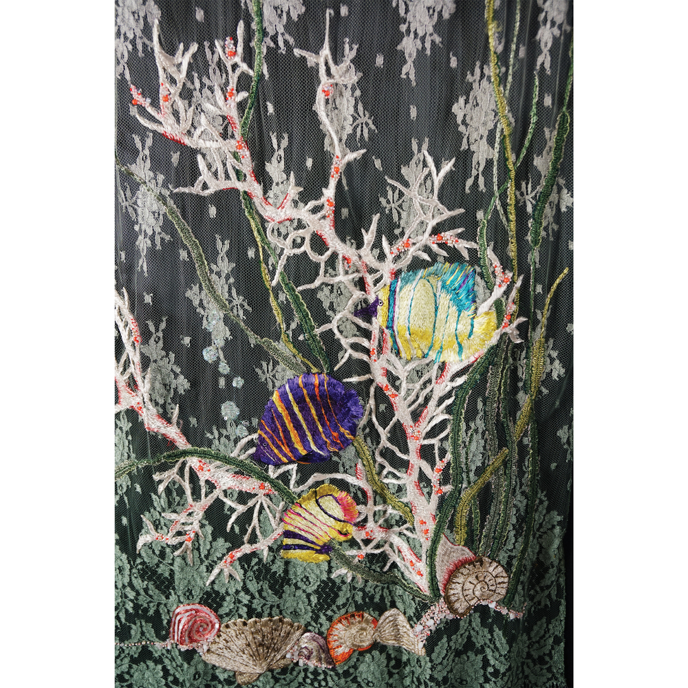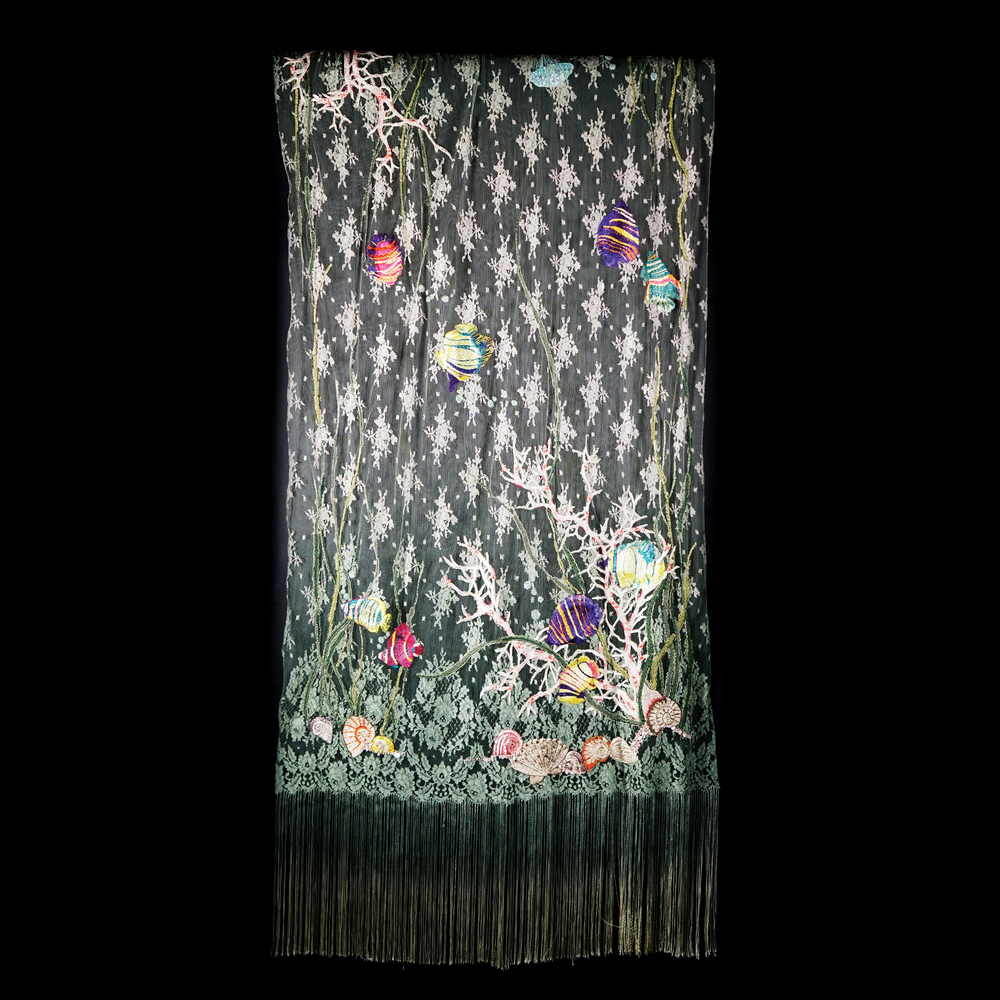 Valentino (attr.) stola di pizzo verde con frange arricchito da ricami nei vivaci toni del viola, dell'azzurro, dell'arancio e giallo a raffigurare un fondale marino, cm. 230x95 circa complessivamente