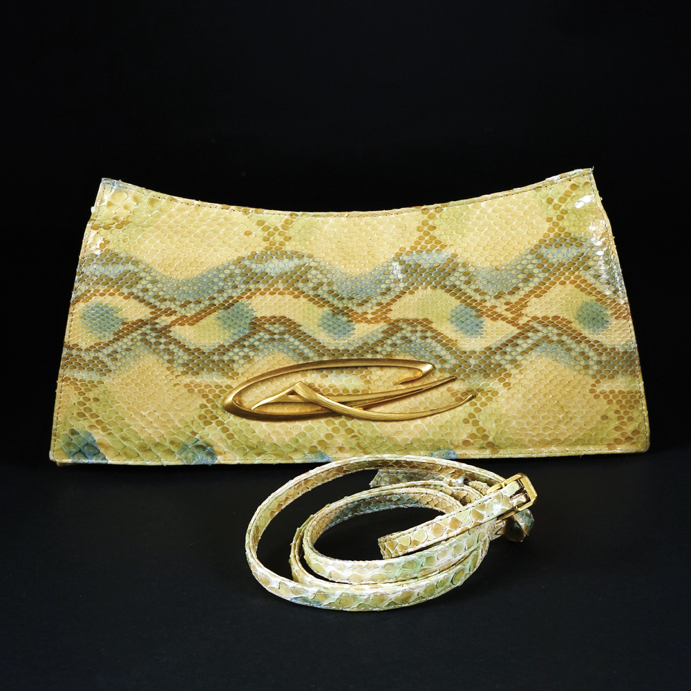 Christian Lacroix borsa a tracolla in pelle di rettile a fondo giallo con disegni geometrici in verde pallido e beige (tracolla scucita)