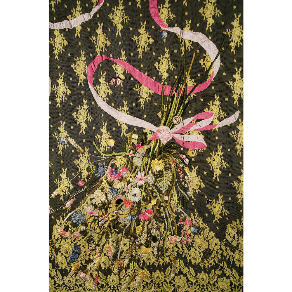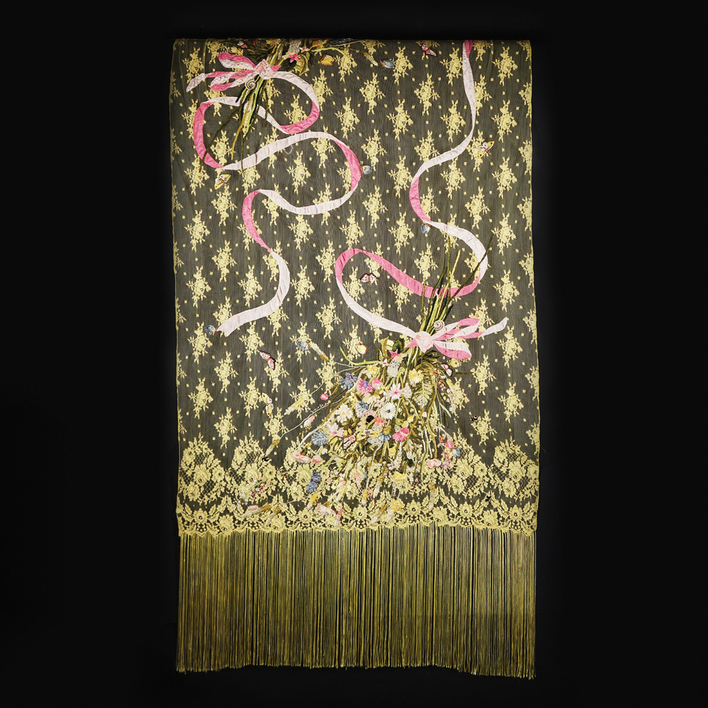 Valentino stola in pizzo giallo con frange, arricchita da mazzi di fiori di campo avvivati da api e farfalle; il tutto ricamato con fili policromi dai toni vivaci, complessivamente cm. 240x95 circa