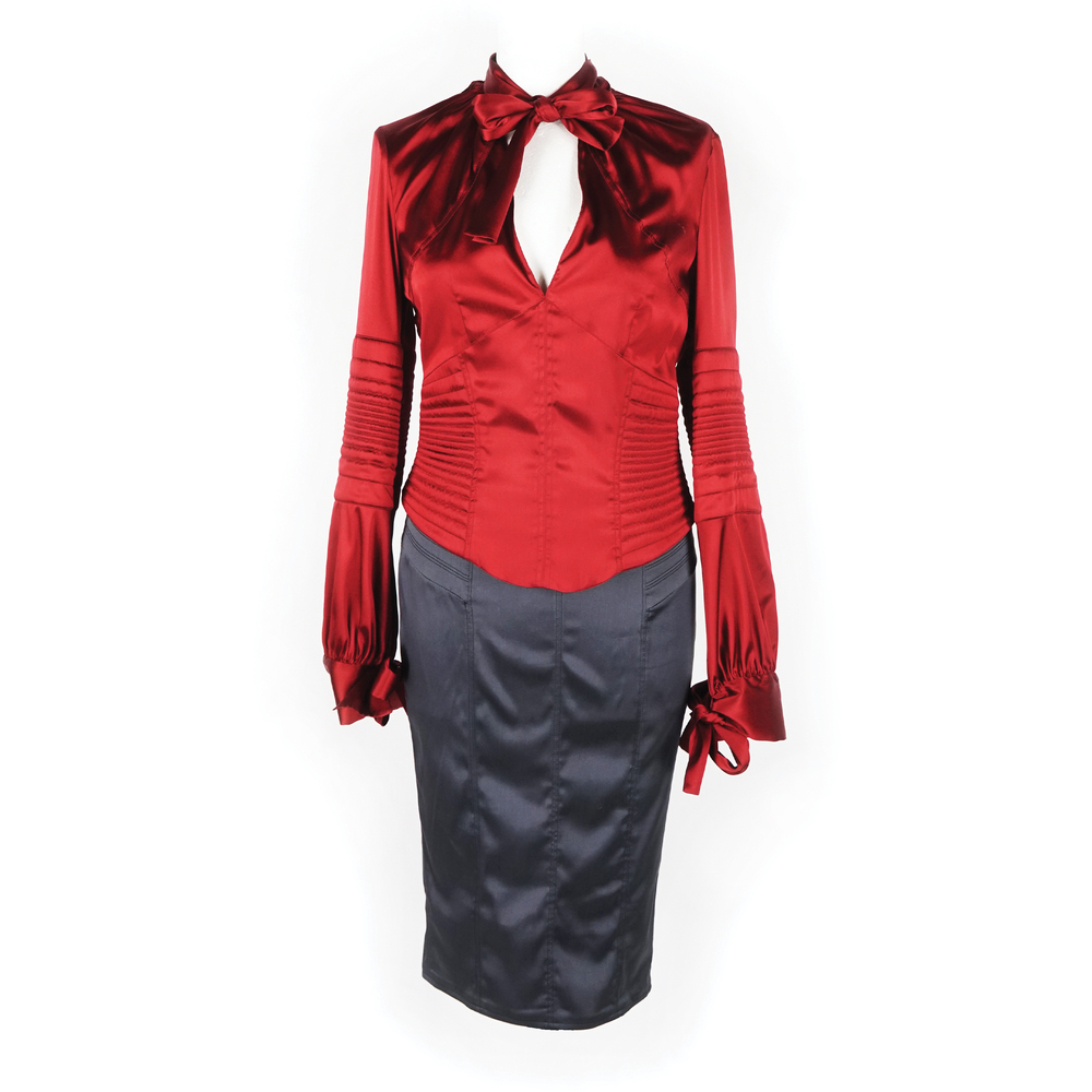 Gucci una camicia di seta rosso scuro misto seta, tg. 42 (nuova con cartellino) UNITA a una gonna di raso grigio, tg. 38