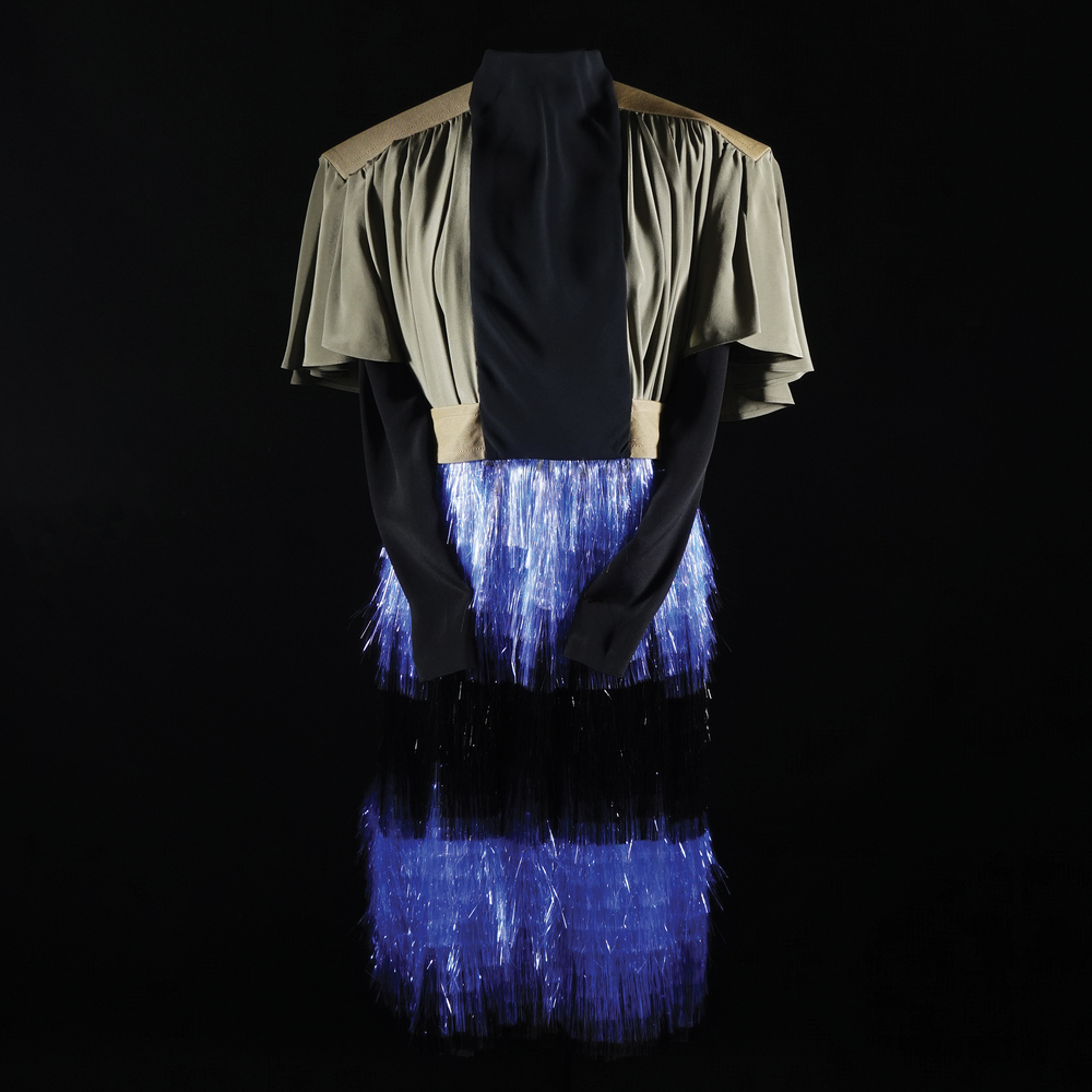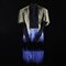 Balenciaga abito in misto seta kaki e nero con cintura; il corpetto con maniche lunghe e mantellina; la gonna con frange sintetiche a righe orizzontali in viola e nero, tg. 36