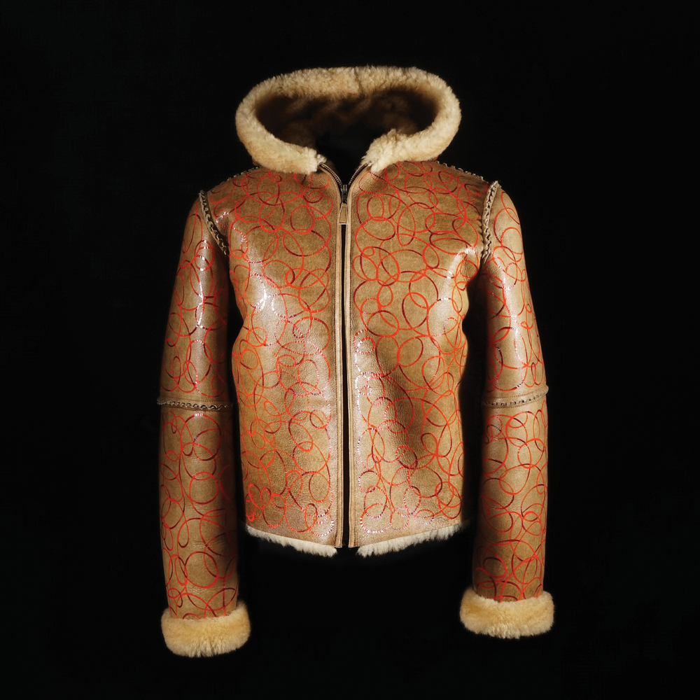 Alaïa giacchino con cappuccio in montone rovesciato decorato a disegni geometrici resi in cromia ruggine