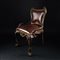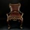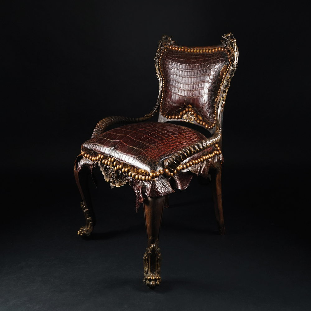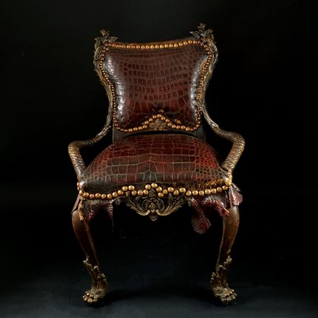Poltrona di noce con seduta e schienale rivestiti in pelle esotica fissata da una sequenza di borchie dorate; braccioli in corno riuniti al dossello da un ramo di foglie lanceolate in bronzo patinato, culminanti in una figura di drago reso a tuttotondo. Gambe anteriori arcuate calzate di zoccoli a zampa ferina parimenti in bronzo dorato; quelle posteriori di linea sfuggente.
