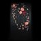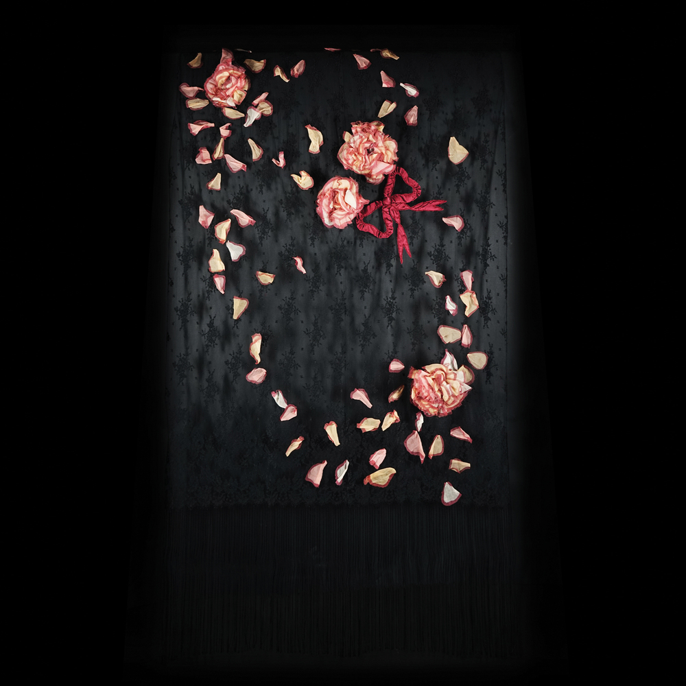 Valentino stola di pizzo nero con frange arricchita da applicazioni di grandi corolle di rose e petali cadenti in organza rosa pallido e rosso bordeaux, cm. 250x100 circa complessivamente
