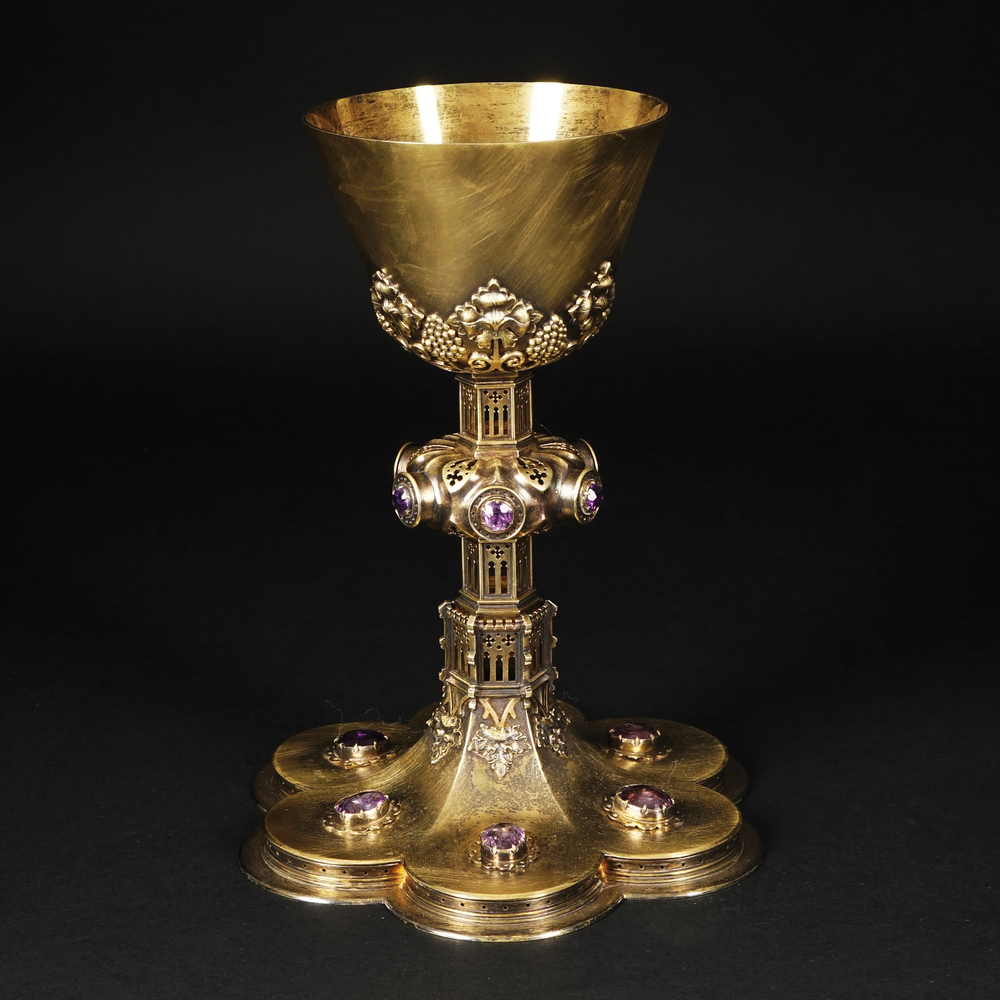 Calice in argento sterling dorato di linea gotica; stelo in parte traforato guarnito da applicazioni di ametiste così come il piede a corolla. Sotto il piede reca inciso in caratteri gotici il nome Mgr. Nicolas Averardi (Nicola Averardi, 1843-1924).