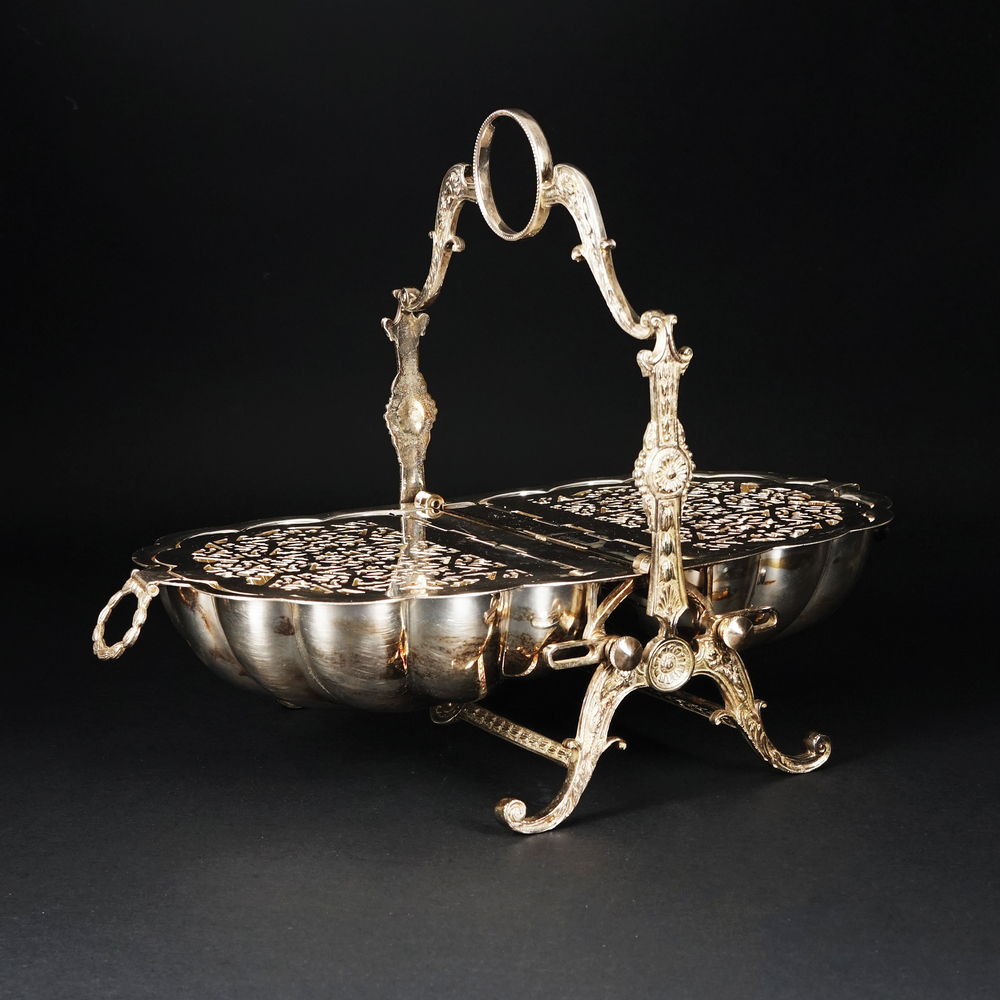 Portabonbons in metallo di Sheffield sbalzato a valve di conchiglia dall'apertura delle quali si svelano due contenitori con coperchio traforato e incernierato; prese ad anello; pieducci a voluta.