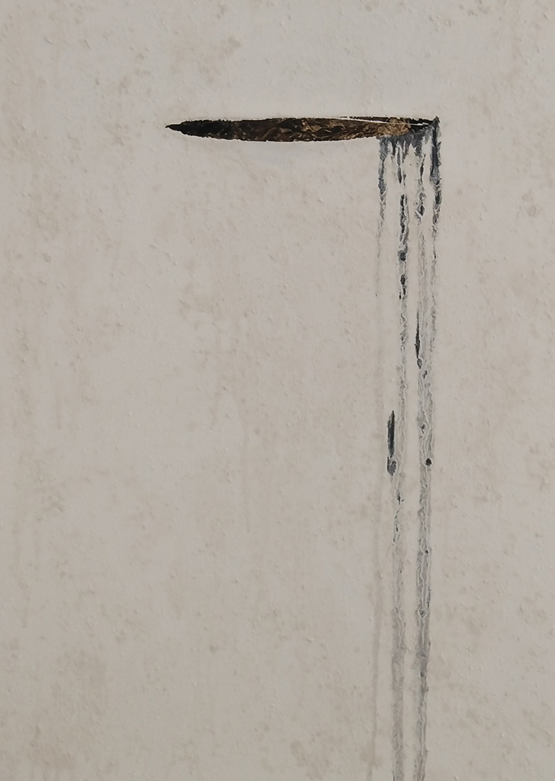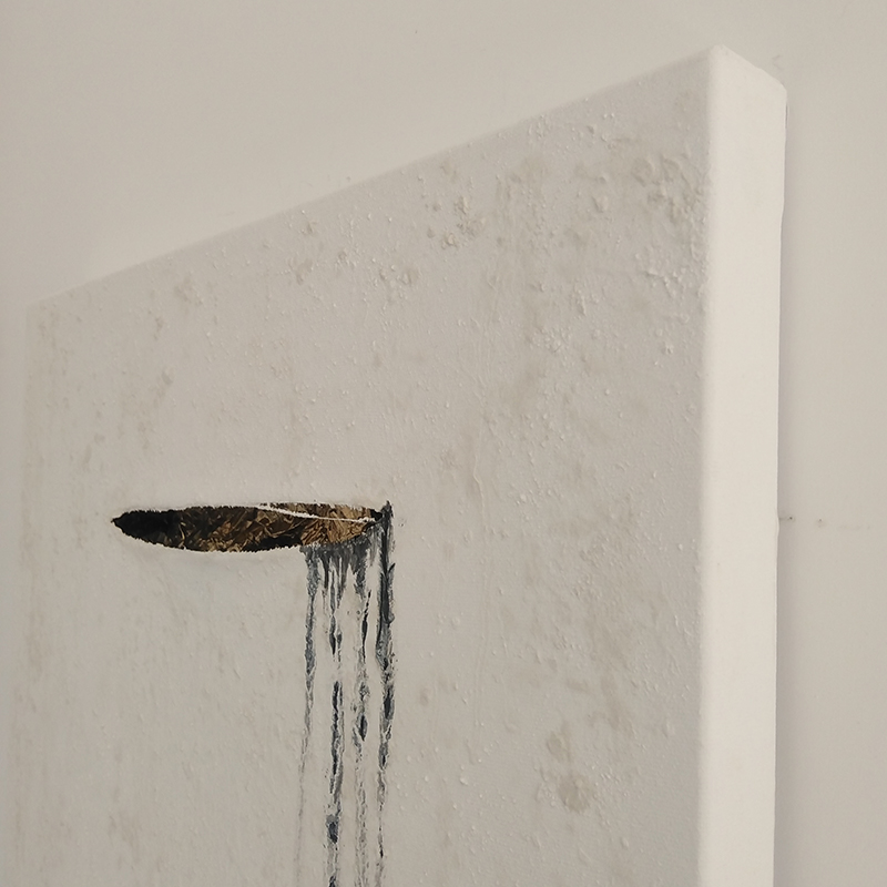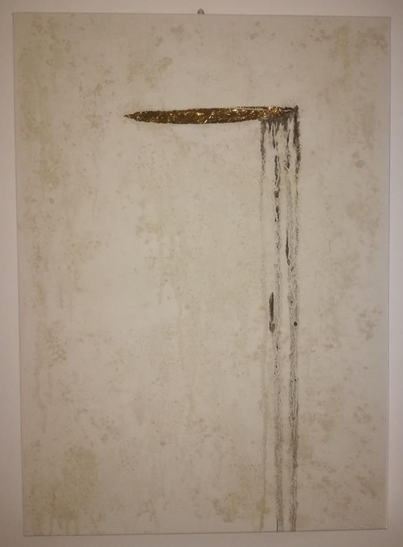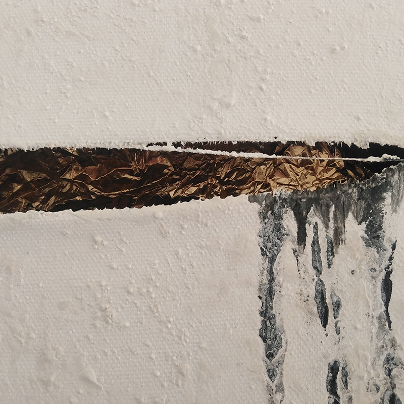 Tecnica mista su tela, fondo gesso e colore. Taglio dove è riportata carta increspata colore oro