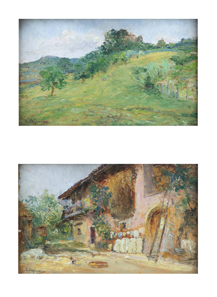 CESARE BISCARRA<BR>Torino 1866 - 1943<BR>a "Paesaggio"<BR>b "Veduta di casa di campagna con cortile"