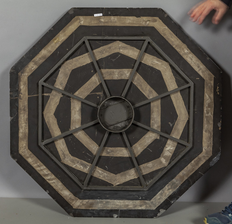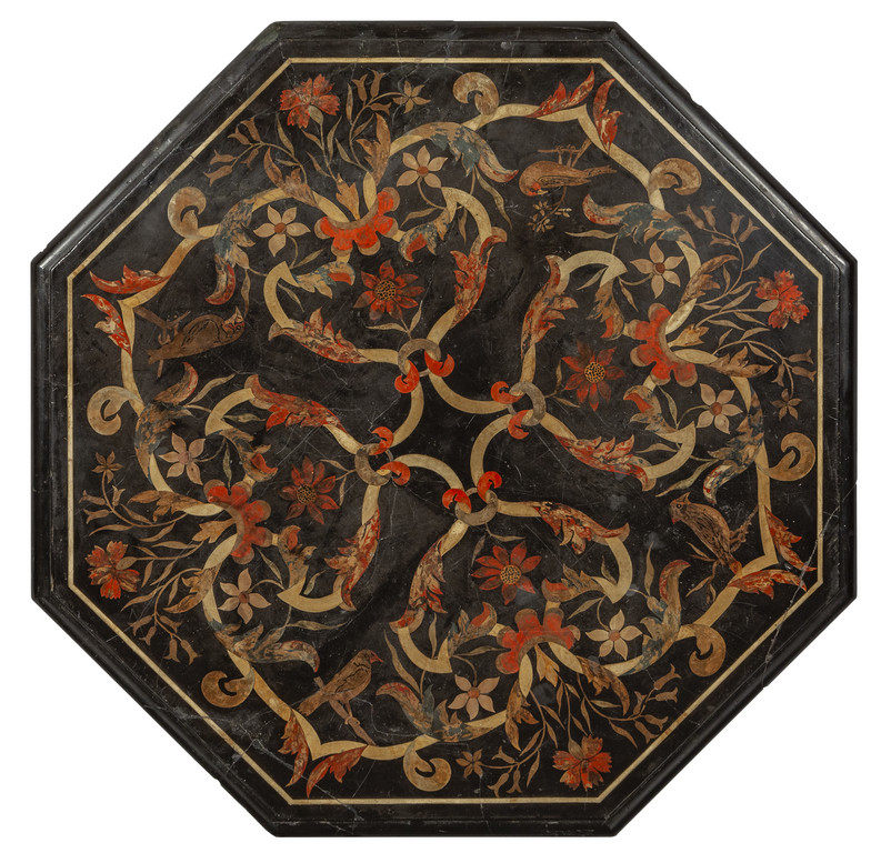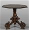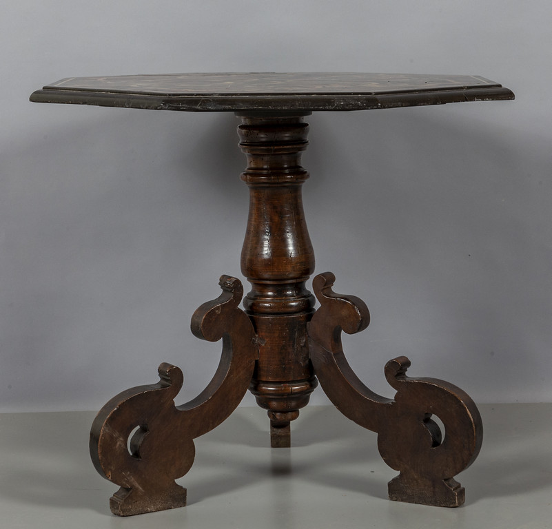 Tavolo ottagonale con piano in scagliola decorato con fiori ed uccellini base in legno di noce a tre piedi Marche fine sec.XVII